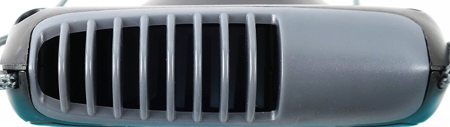 Air flow blows up toward your face as it hangs from your neck.