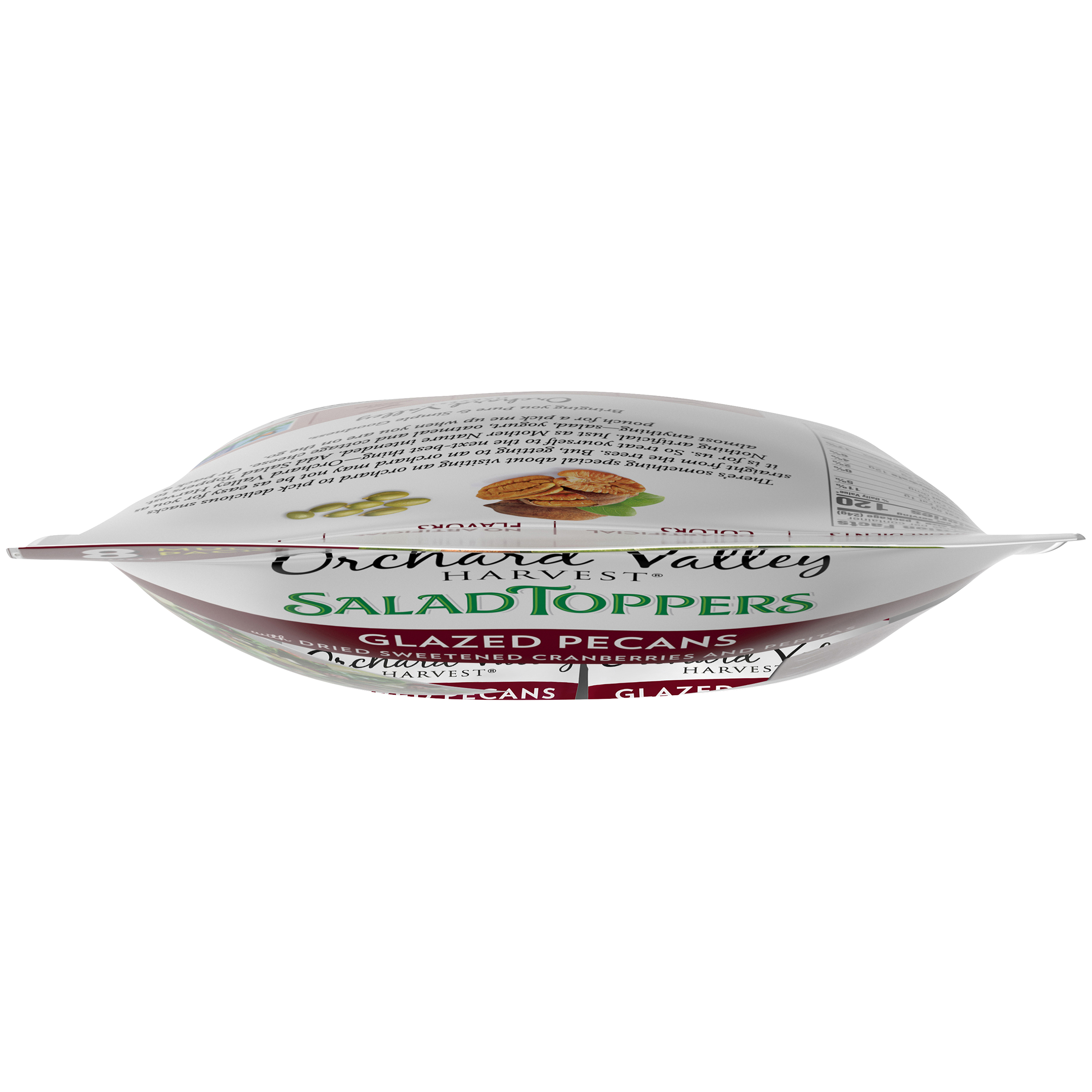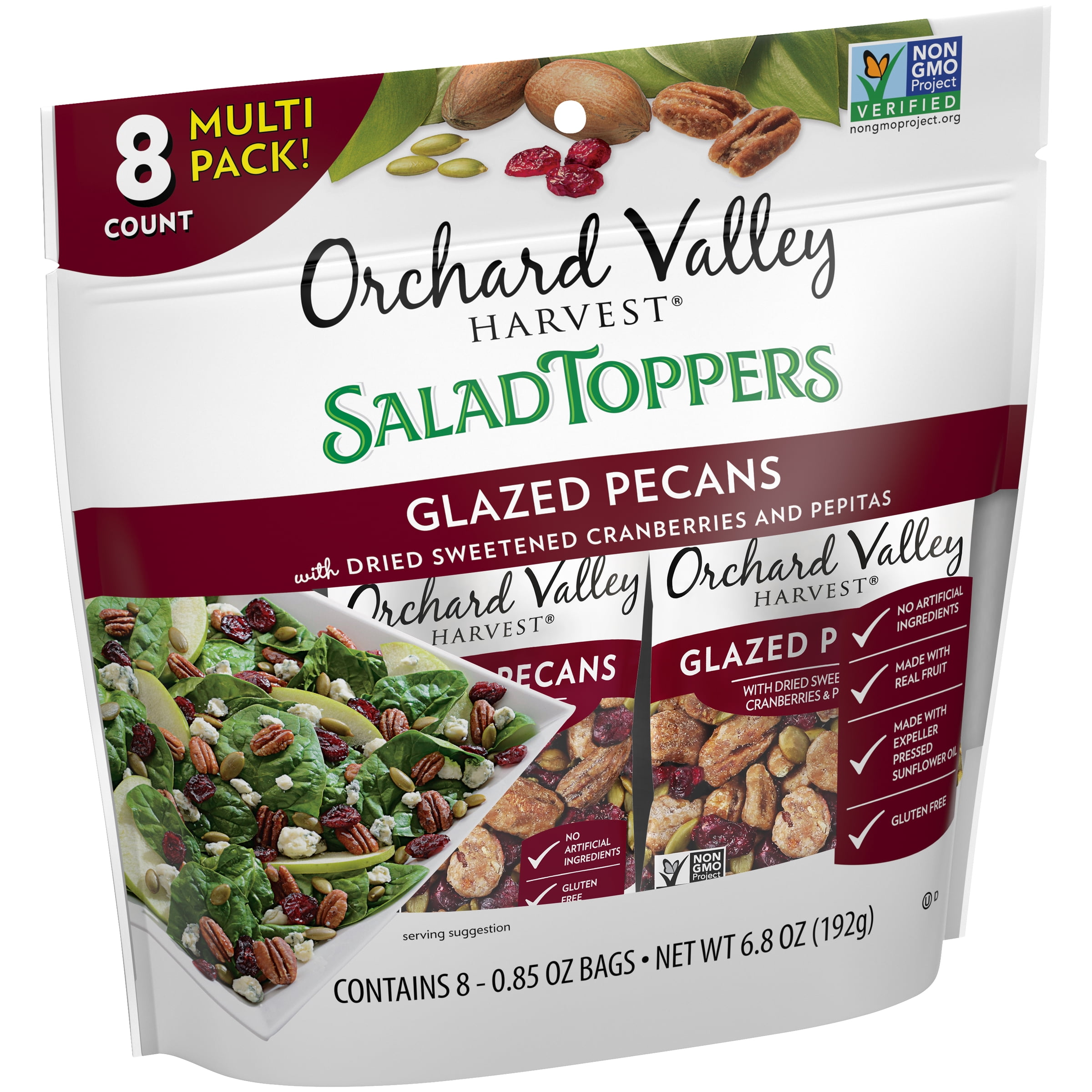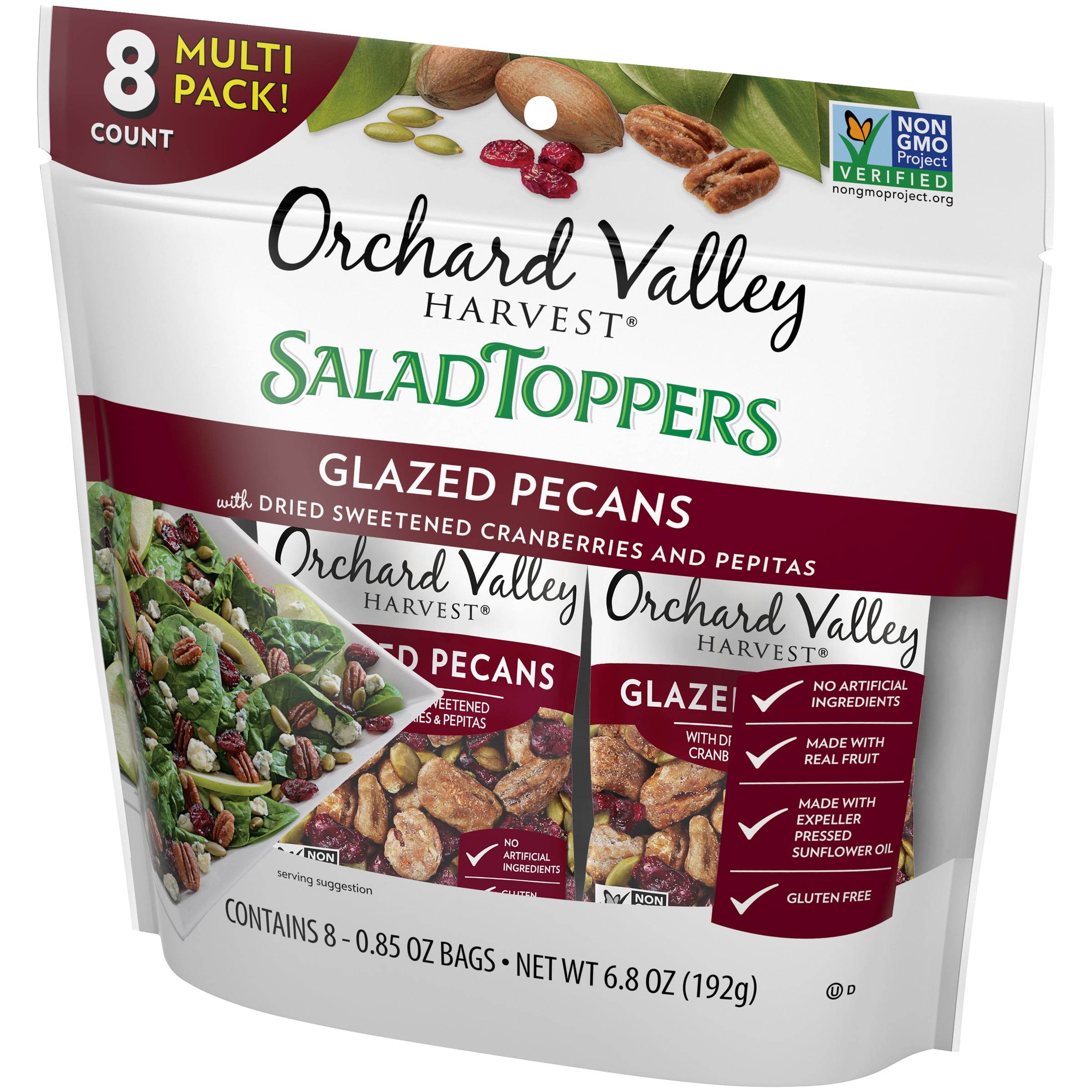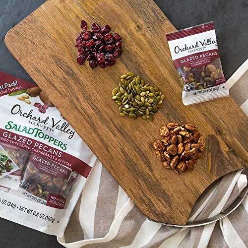 Contains 8 – 0.85 ounce packs of Glazed Pecans Salad Toppers Glazed pecans with dried sweetened cranberries and pepitas Orchard Valley Harvest is dedicated to finding pure and simple nuts and dried sweetened fruit that support your active lifestyle All Orchard Valley Harvest products are Non-GMO Project Verified and do not contain any artificial ingredients, colors, flavors or preservatives Add taste and crunch to everyday salads, yogurt, oatmeal, or cottage cheese