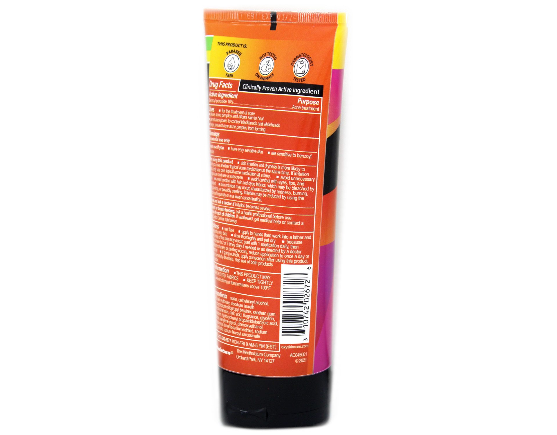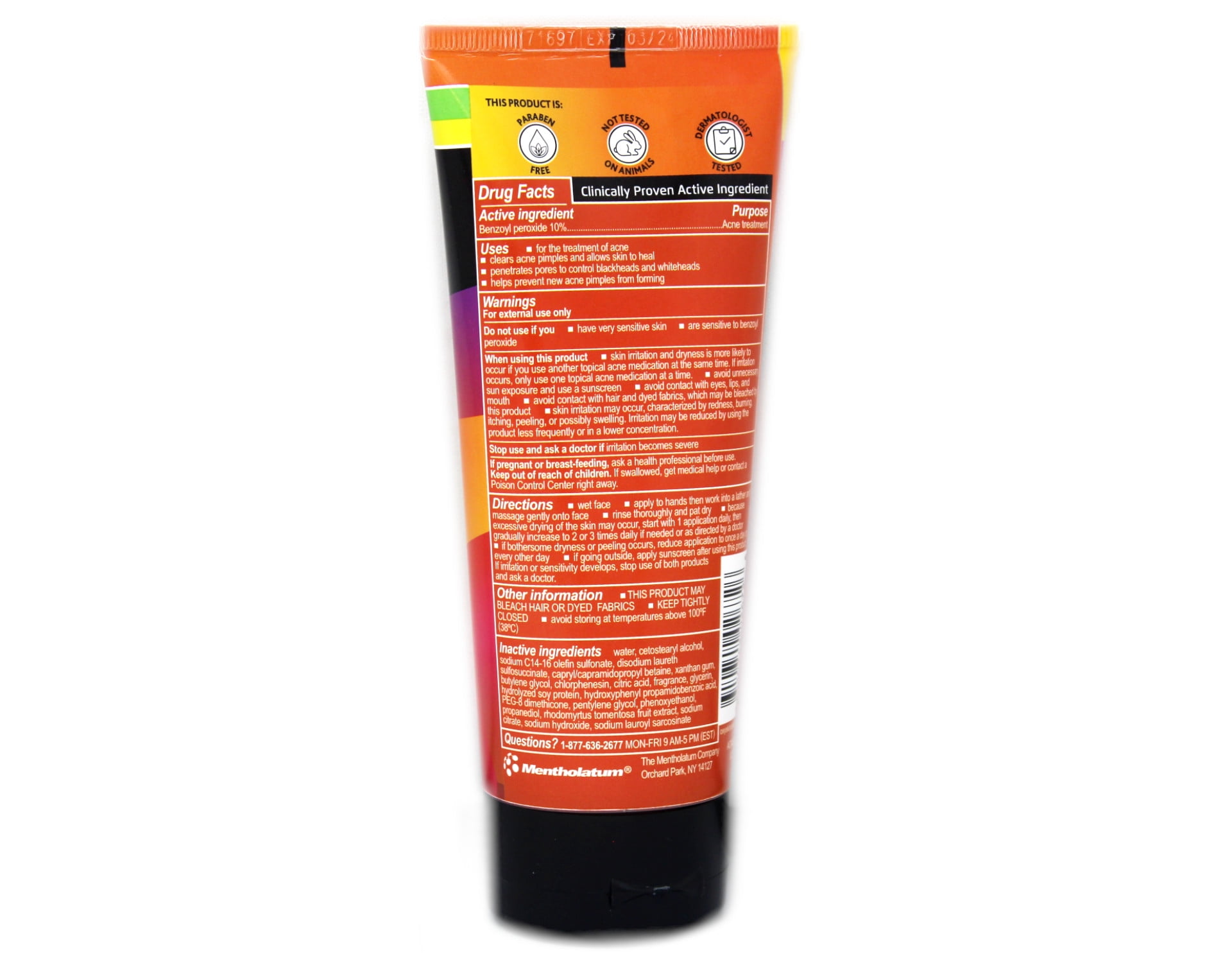 Heading Purpose Acne Treatment Manufacturer Mentholatum Active Ingredients Benzoyl Peroxide 10% Directions Wet face. Apply to hands then work into a lather and massage gently onto face. Rinse thoroughly and pat dry. Because excessive drying of the skin may occur, start with one application daily, then gradually increase to 2 or 3 times daily if needed or as directed by a doctor. If bothersome dryness or peeling occurs, reduce usage to once a day or every other day. If going outside, apply sunscreen after using this product. If irritation or sensitivity develops, stop use of both products and ask a doctor. This product may bleach hair or dyed fabrics. Keep tightly closed. Avoid storing at temperatures above 100 degrees F (38 degrees C). Inactive Ingredients Anhydrous Citric Acid; Butylene Glycol; Capryl/Capramidopropyl Betaine; Cetostearyl Alcohol; Cocamidopropyl Betaine; Diazolidinyl Urea; Disodium PEG-5 Laurylcitrate Propamidobenzoic Acid; Methylparaben; PEG-8 Dimethicone; Pentylene Glycol; Propylparaben; Purified Water; Sodium Citrate; Sodium Lauroyl Sarcosinate; Xanthan Gum Uses Treats and helps prevent acne. Kills acne bacteria. Specially formulated to soothe irritation and boost skin cell renewal. For visibly clearer skin. Dermatologist tested. Warnings For external use only. Do not use if you: have very sensitive skin; are sensitive to benzoyl peroxide. When using this product: skin irritation and dryness is more likely to occur if you use another topical acne medication at the same time. If irritation occurs, only use one topical acne medication at a time; avoid unnecessary sun exposure and use a sunscreen; avoid contact with eyes, lips, and mouth; avoid contact with hair and dyed fabrics, which may be bleached by this product; skin irritation may occur, characterized by redness, burning, itching, peeling, or possibly swelling. Irritation may be reduced by using the product less frequently or in a lower concentration. Stop use and ask a doctor if irritation becomes severe. If pregnant or breast-feeding, ask a health professional before use. Keep out of reach of children. If swallowed, get medical help or contact a Poison Control Center right away. hide
