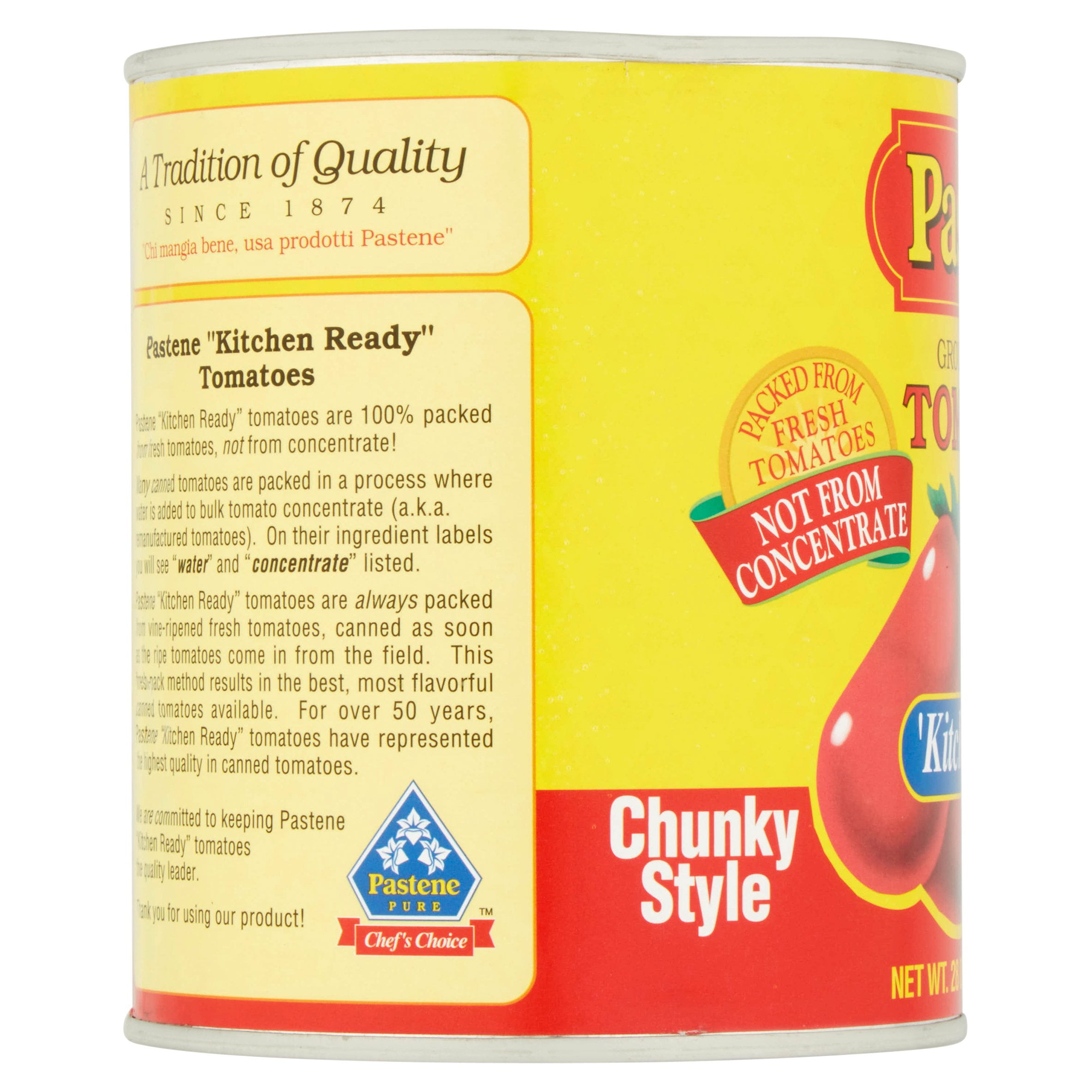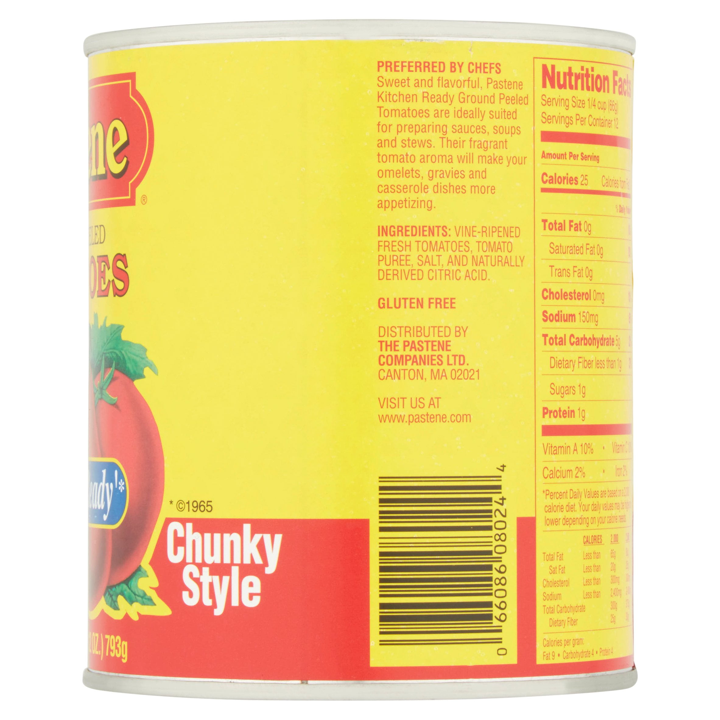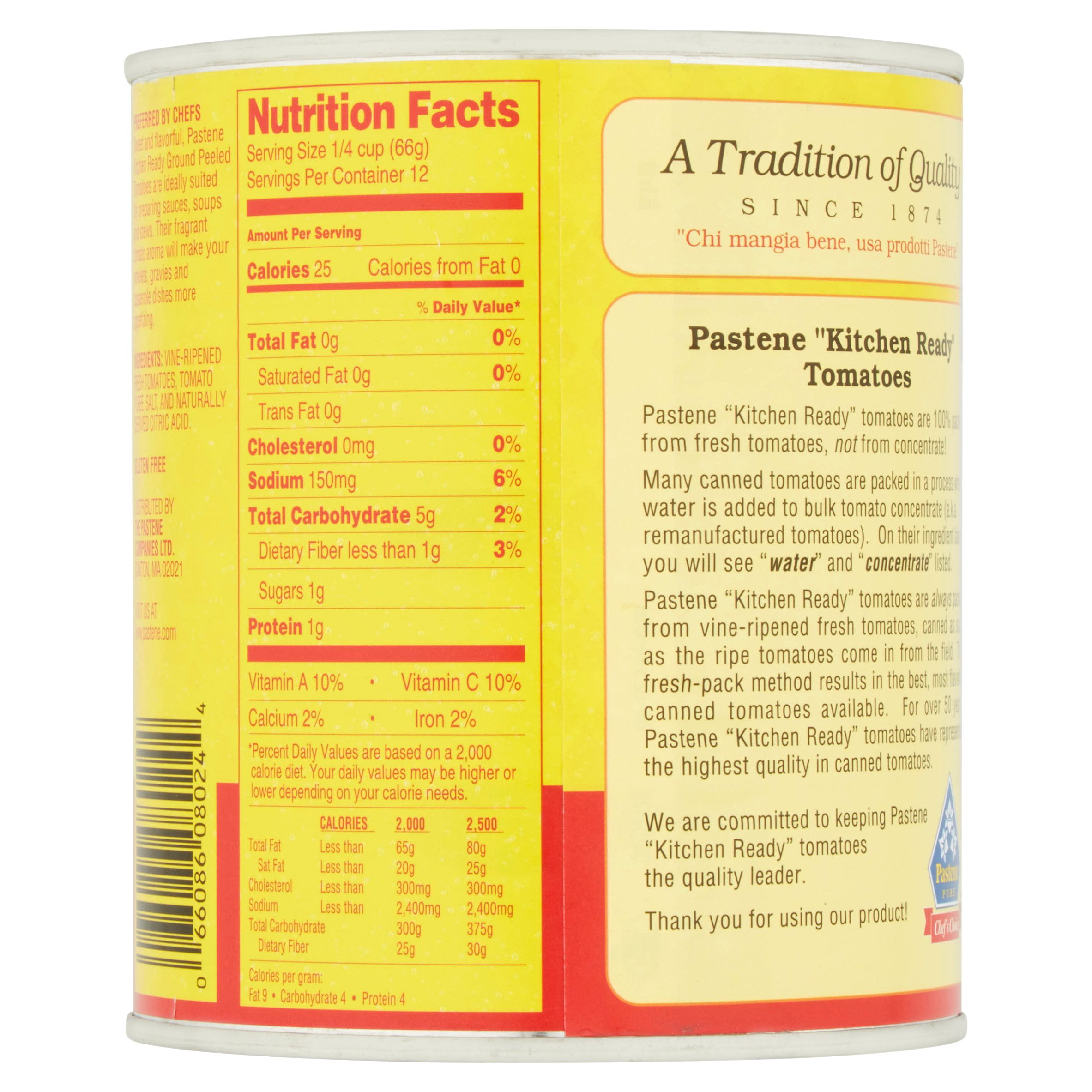 - Ground peeled tomatoes. Packed from fresh tomatoes, not from concentrate. Preferred by chefs. Sweet and flavorful, Pastene Kitchen Ready Ground Peeled Tomatoes are ideally suited for preparing sauce, soups and stews. Their fragrant tomato aroma will make your omelets, gravies and casserole dishes more appetizing. Pastene Kitchen Ready Tomatoes are 100% packed from fresh tomatoes, not from concentrate! Many canned tomatoes are packed in a process where water is added to bulk tomato concentrate (aka remanufactured tomatoes). On their ingredient labels you will see water and concentrate listed. Pastene Kitchen Ready Tomatoes are always packed from vine-ripened fresh tomatoes, canned as soon as the ripe tomatoes come in from the field. This fresh-pack method results in the best, most flavorful canned tomatoes available. For over 50 years, Pastene Kitchen Ready tomatoes have represented the highest quality in canned tomatoes. We are committed to keeping Pastene Kitchen Ready tomatoes the quality leader. Thank you for using our product!