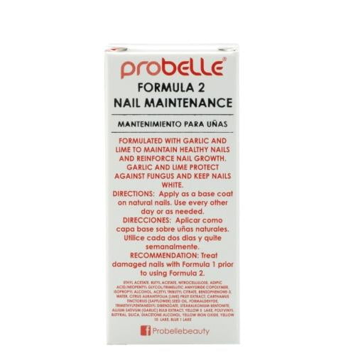 Nail Maintenance, Formula 2, Box 0.5 OZ With garlic & lime. Maintains nails stronger and healthier. Formulated with garlic and lime to maintain healthy nails and reinforce nail growth. Garlic and lime protect against fungus and keep nails white. Facebook: Probellebeauty. www.Pro-Belle.com. Bottled in USA. Apply as a base coat on natural nails. Use every other day or as needed. Recommendation: Treat damaged nails with Formula 1 prior to using Formula 2. 0.5 fl oz (15 ml) Miami, FL