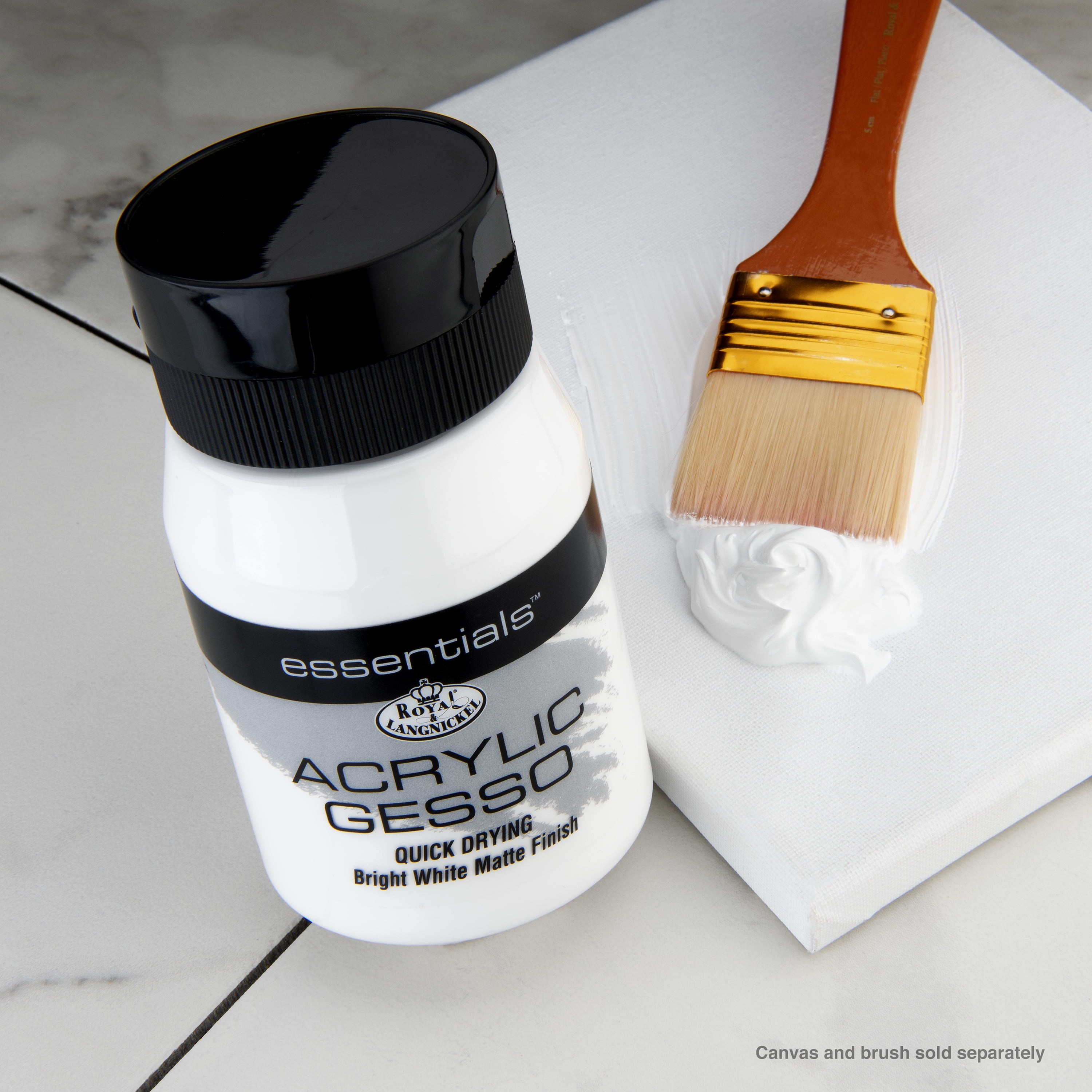 Royal & Langnickel Essentials 500ml Acrylic Gesso gets your canvas ready for acrylic paint. Gesso primes the surface for painting, making the surface slightly textured and ready to accept acrylic paint. Without gesso, the paint would soak into the weave of the canvas. Apply gesso to nearly any surface.
