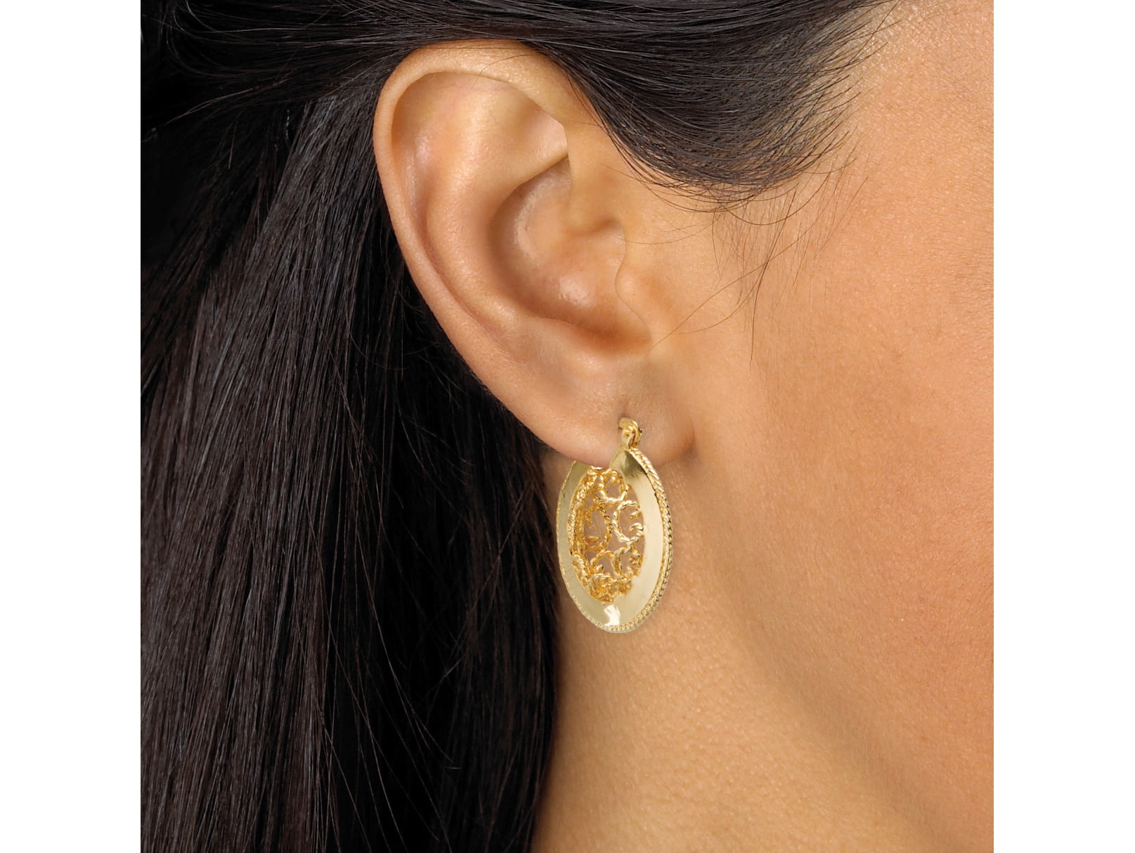 Exotic scroll hoop earrings add fabulous flair to new-season outfits, catching every eye with their exciting and intricate design in gleaming yellow gold tone. 1.25" diameter. With lever backs. 23448