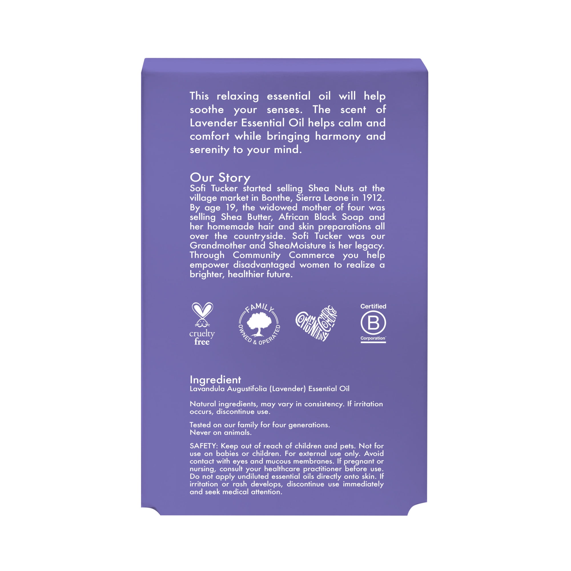 SheaMoisture introduces you to the wonder of exotic oils. SheaMoisture’s 100% Pure Lavender Essential Oil is relaxing and will help soothe your senses and help with clear skin. The scent of Lavender Essential Oil helps calm and comfort while bringing harmony and serenity to your mind. This oil serum with pure lavender oil is a multi-tasking oil. Discover your calm by using it in a room diffuser for an aromatic atmosphere. Make this lavender body oil and skin therapy oil a part of your daily skincare regimen. Blend it into a body lotion or carrier oil to customize. Dilute and add to running water for a rich bath oil for dry skin treatment. Do NOT ingest or put directly onto your skin. Add a few drops to your body lotion. SheaMoisture’s Story: SheaMoisture is the legacy of Sofi Tucker, a pioneering mother of four and an entrepreneur, who sold Shea Butter, African Black Soap, and homemade beauty preparations in Sierra Leone in 1912. We honor her vision by continuing to formulate with Raw Shea Butter handcrafted by women in Africa. With every purchase, you show support for our mission to reinvest back in our communities. Ethically traded ingredients sustainably produced. Pioneering Community Commerce and Fair Trade since 1912. Tested on the Tucker family for four generations. Never on animals.