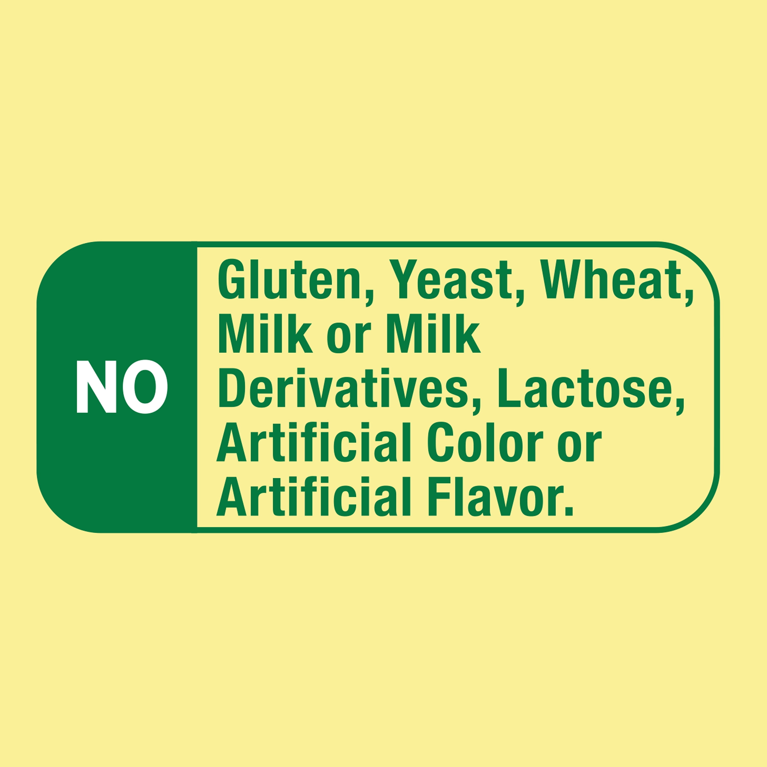 - No gluten, yeast, wheat, milk or milk derivatives, lactose, artificial color, or artificial flavor