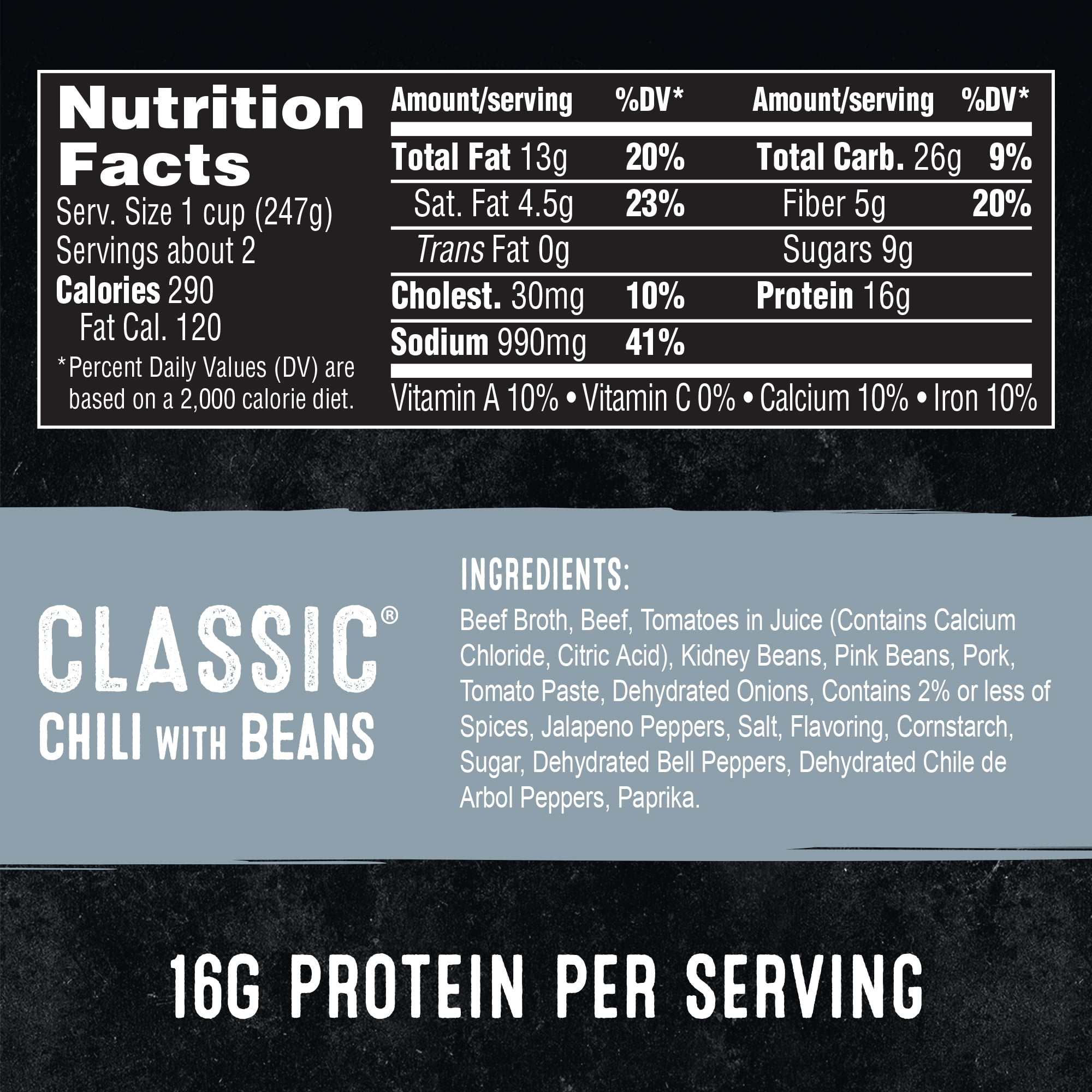 - Slowly simmered to bring out the rich flavors from our ingredients, this canned chili has classic that fiery chili taste your family will love