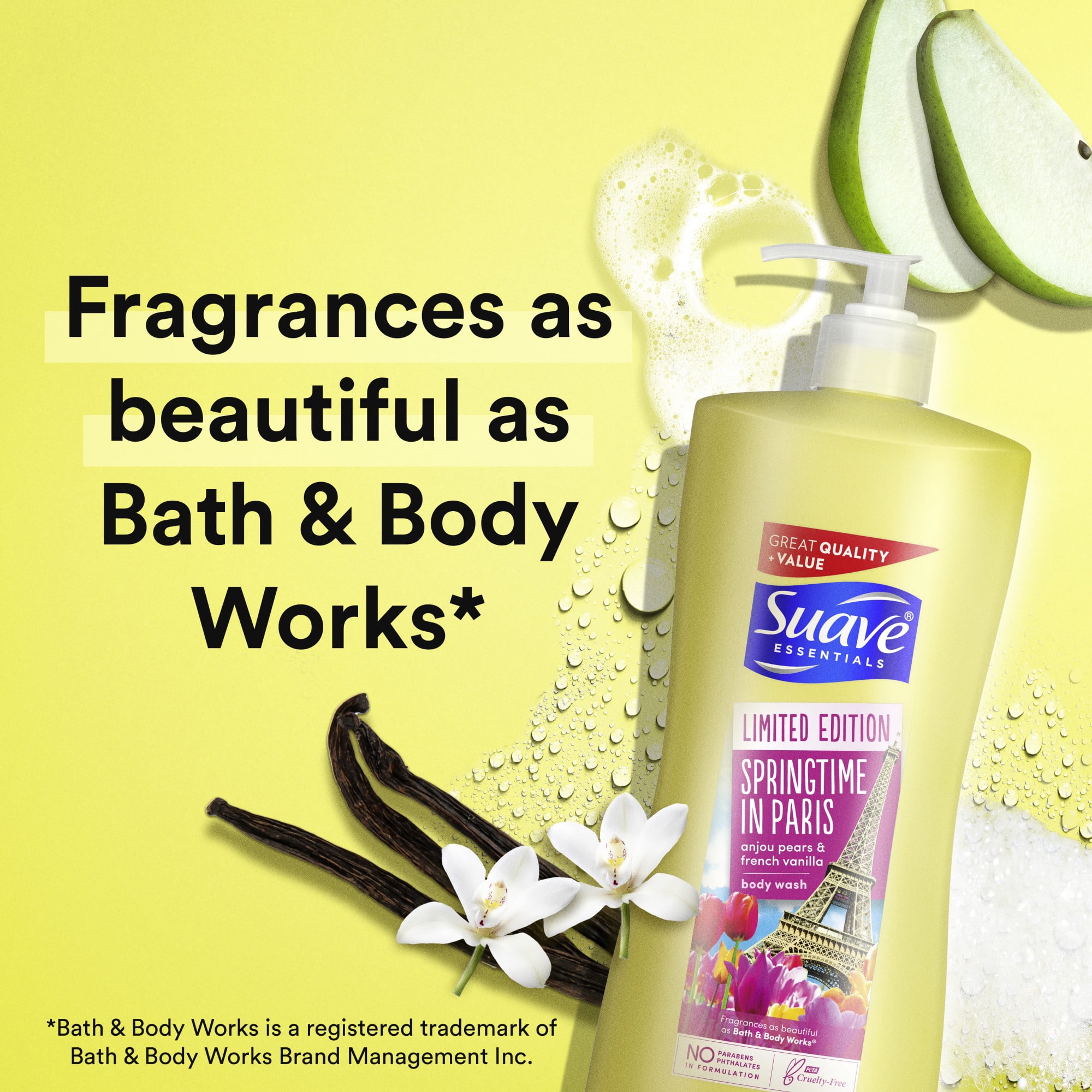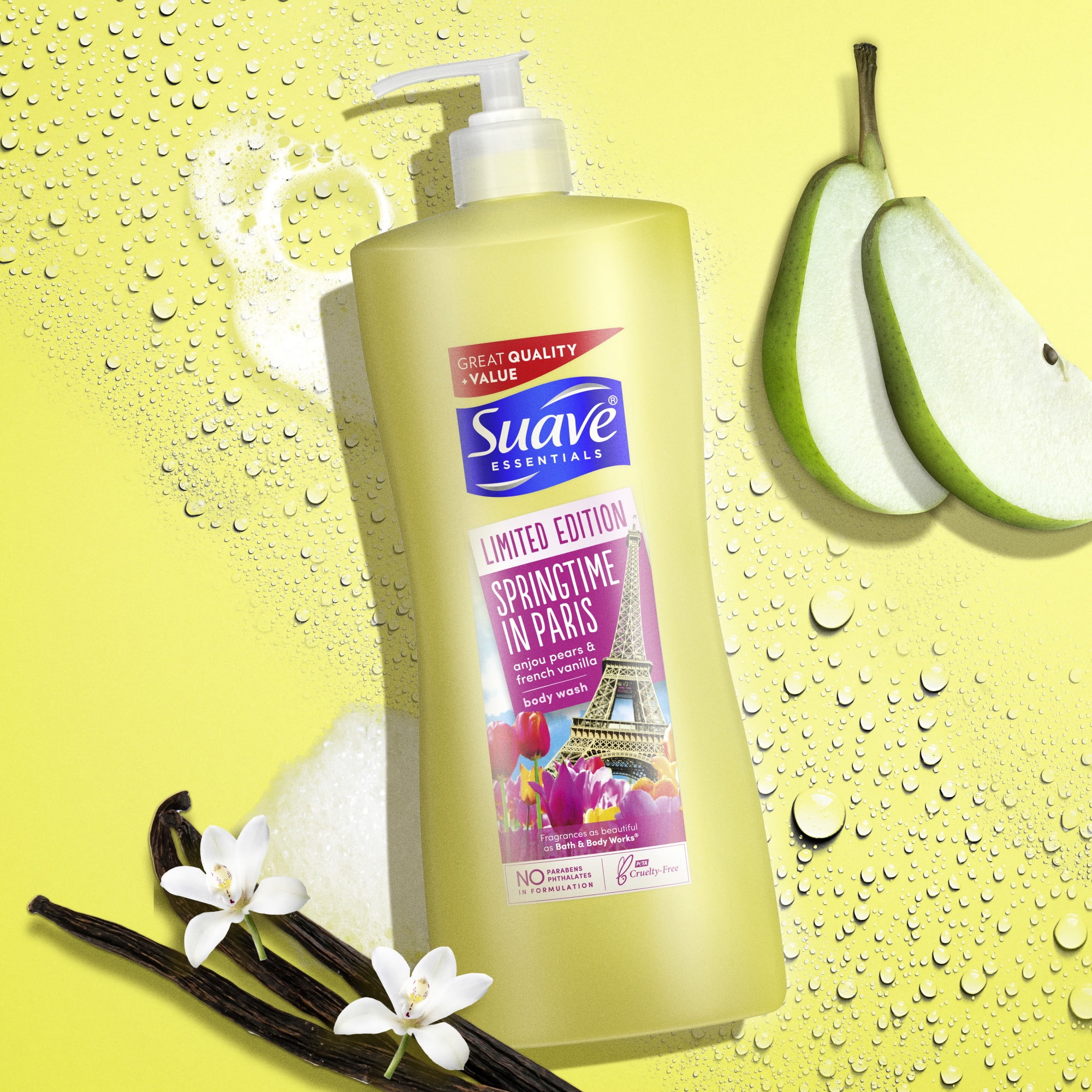 New Suave Limited Edition Springtime in Paris body wash is made with fun, fresh scents that will leave your skin feeling clean and soft, and smelling great. Whether you prefer beautiful floral blooms, fresh and fruity bursts or luxuriously creamy body washes, were sure you will love our fragrances. We invite you to try all of our delightfully crafted Suave Essentials body wash fragrances. Fragrance: Awaken your senses and escape into springtime in Paris with this alluring body wash. Enjoy the wondrous scents of Anjou pear and French vanilla while you cleanse your skin with luxurious lather. Product: Suave Springtime in Paris Body Wash is infused with passion flower extract and vanilla extract. Suave body washes will leave your skin feeling soft and smooth, never dry. This liquid body wash creates a rich creamy lather that rinses clean for an enjoyable and refreshing shower experience. Suave body washes, shower gels and other beauty products are perfect for everyday use and great for the whole family. We promise you’ll love your purchase, but if not, we’ll replace it or refund you. Full details are available at www.suave.com or call us at 1-800-782-8301. This pack is recyclable. Rinse. Recycle. Re-imagine.