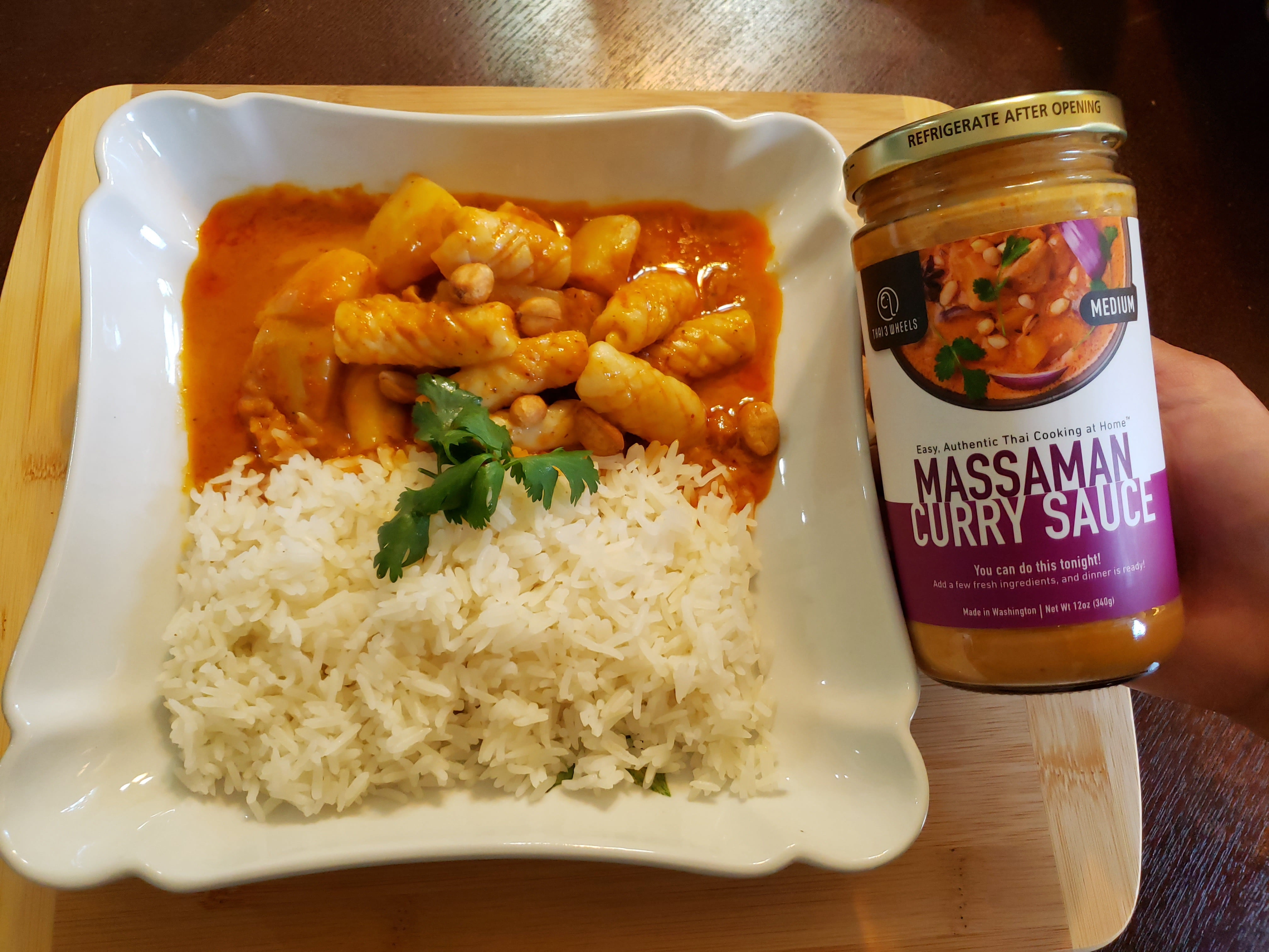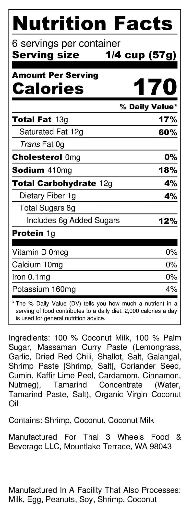 Thai 3 Wheels Massaman Curry (1 Pack) is a hearty, creamy fusion sauce where traditional Thai flavors mingle with a rich blend of Indian spices like coriander, cumin, cardamom, cinnamon, and nutmeg. Now you can make the real thing at home using our cooking sauce.