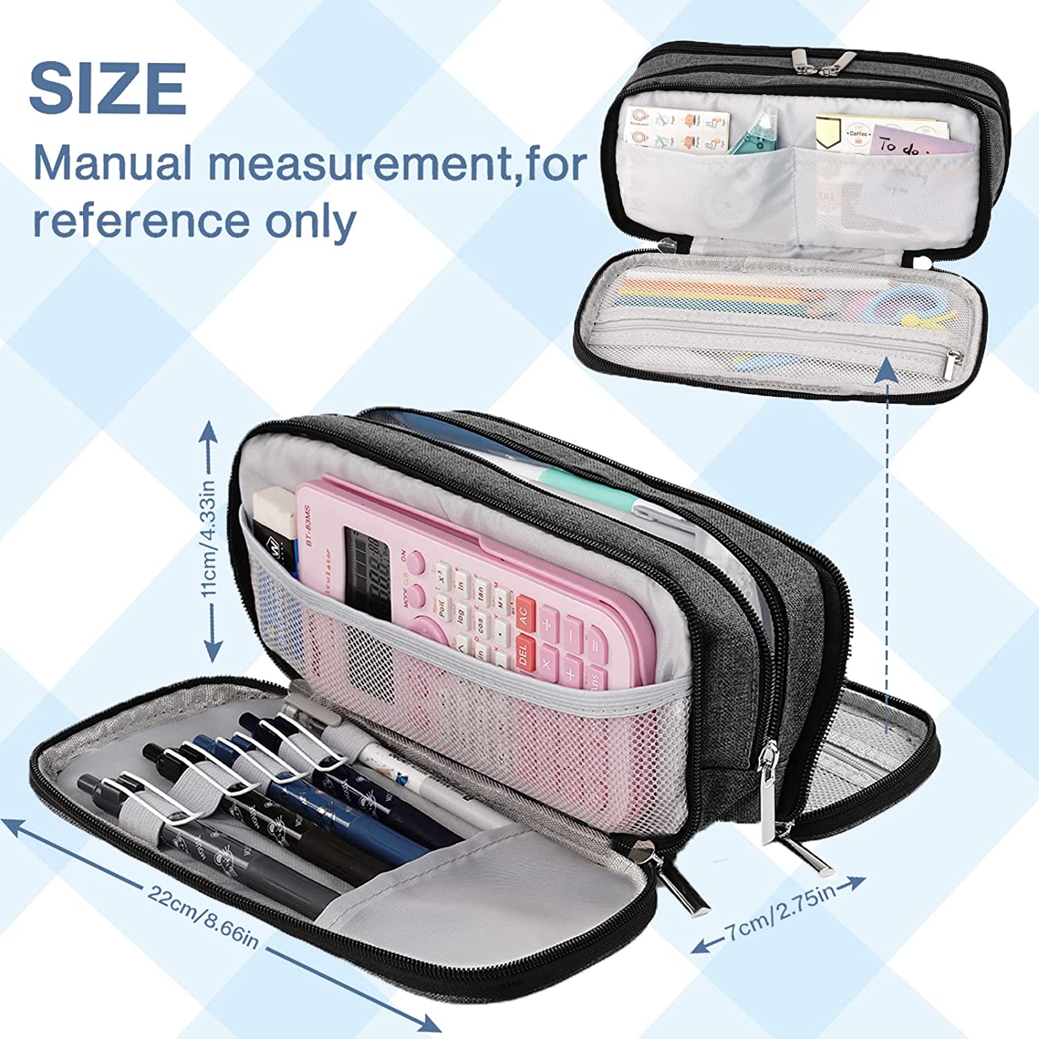 Pencil Case, Large Capacity Pencil Case for Kids Adults Teen, Handheld 3 Compartments Pencil Box Pouch Stationery Bag, Gray