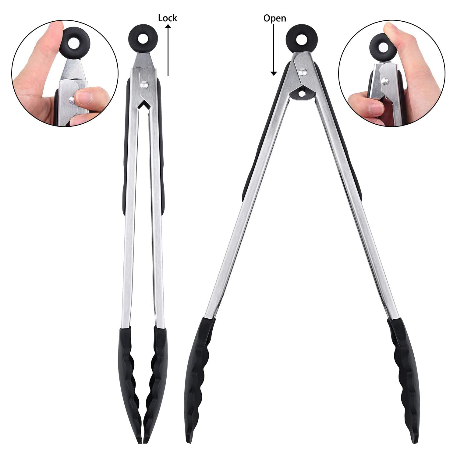 Premium Stainless Steel Locking Kitchen Tongs with Silicon Tips-for Cooking, Serving, Grill, BBQ & Salad (Black)