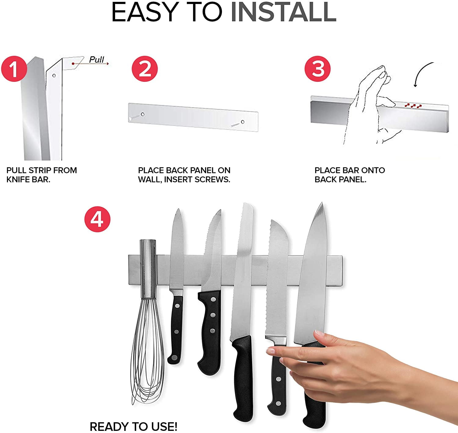- POWERFUL MAGNETIC KNIFE BAR: This modern magnetic knife bar is covered in an elegant, satin finished, high grade stainless steel that will compliment your kitchen du00e9cor.
