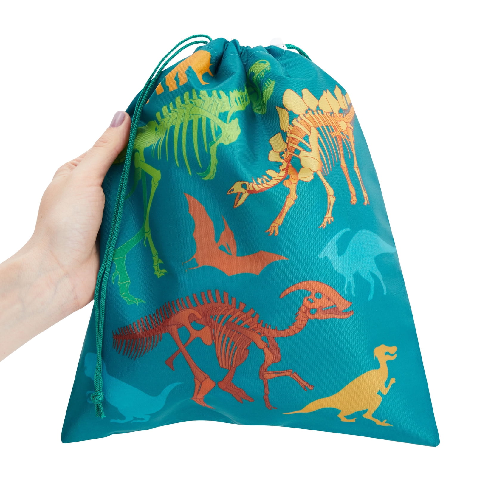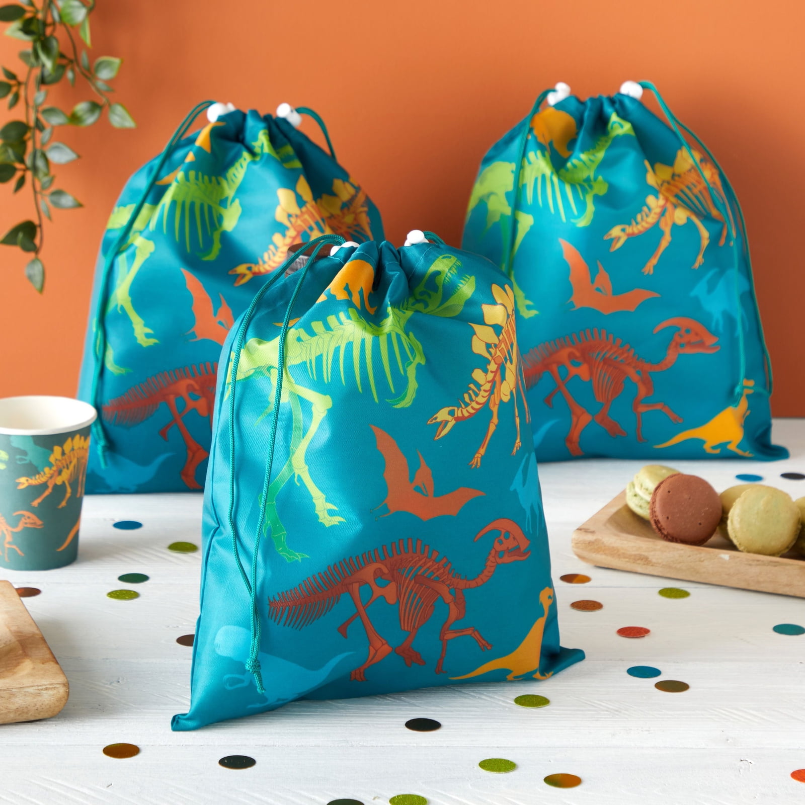 - Dinosaur Drawstring Bags: Fill these dinosaur party bags with an endless assortment of candy, cookies, action figures, dolls, and goodie bag toys to create the perfect loot bags for your guests.