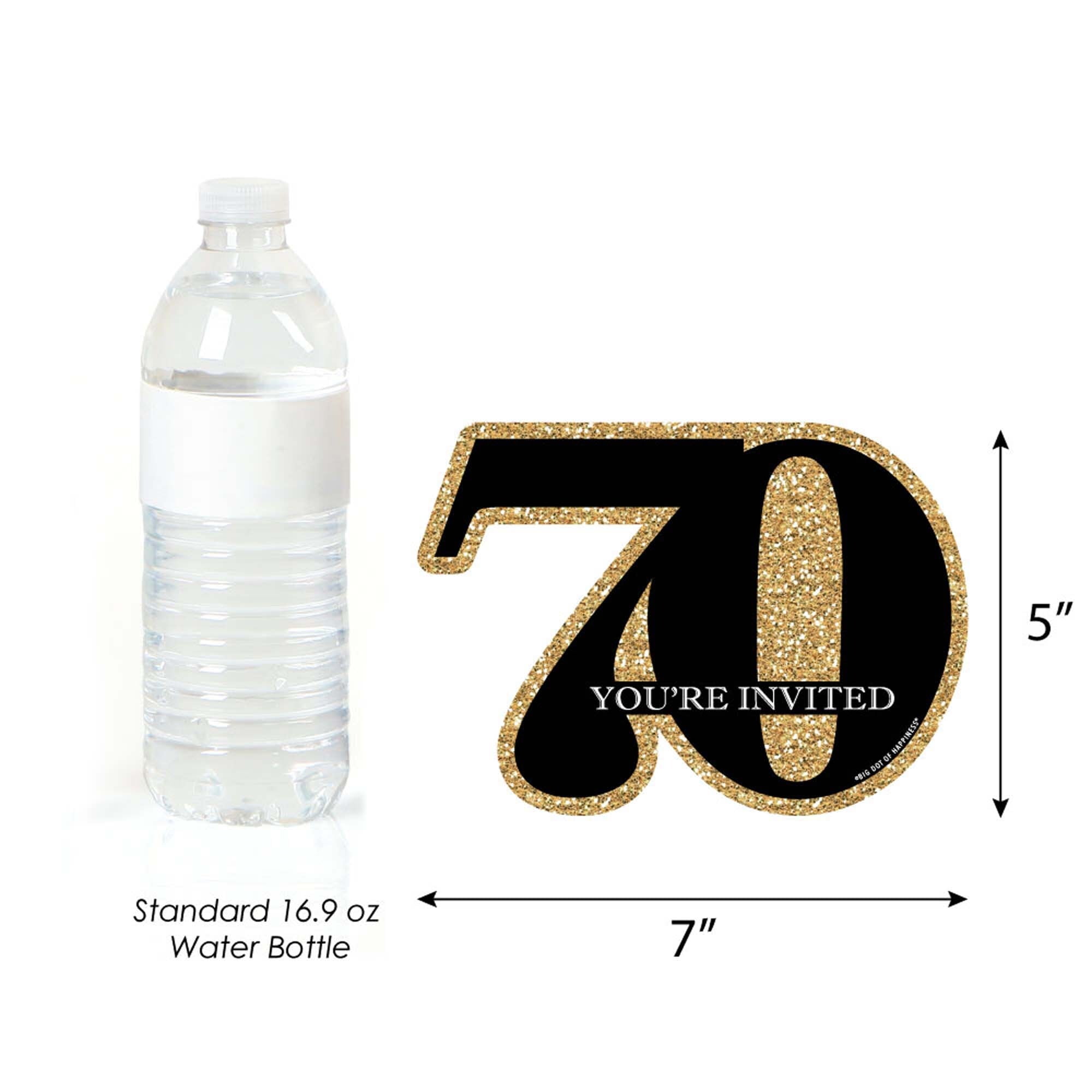 - Adult 70th Birthday – Gold party invitations SIZE 7 inches by 5 inches. The included envelopes measure 5 inches by 7 inches. The back of each Adult 70th Birthday – Gold party invitation has space to add your party details: For: Date: Time: Place: Given By: RSVP: Adult 70th Birthday Fill-In Invitations use a No-Mess Glitter Print: Our invitations are designed with a printed image of glitter, eliminating glitter flake while maximizing bling effect!