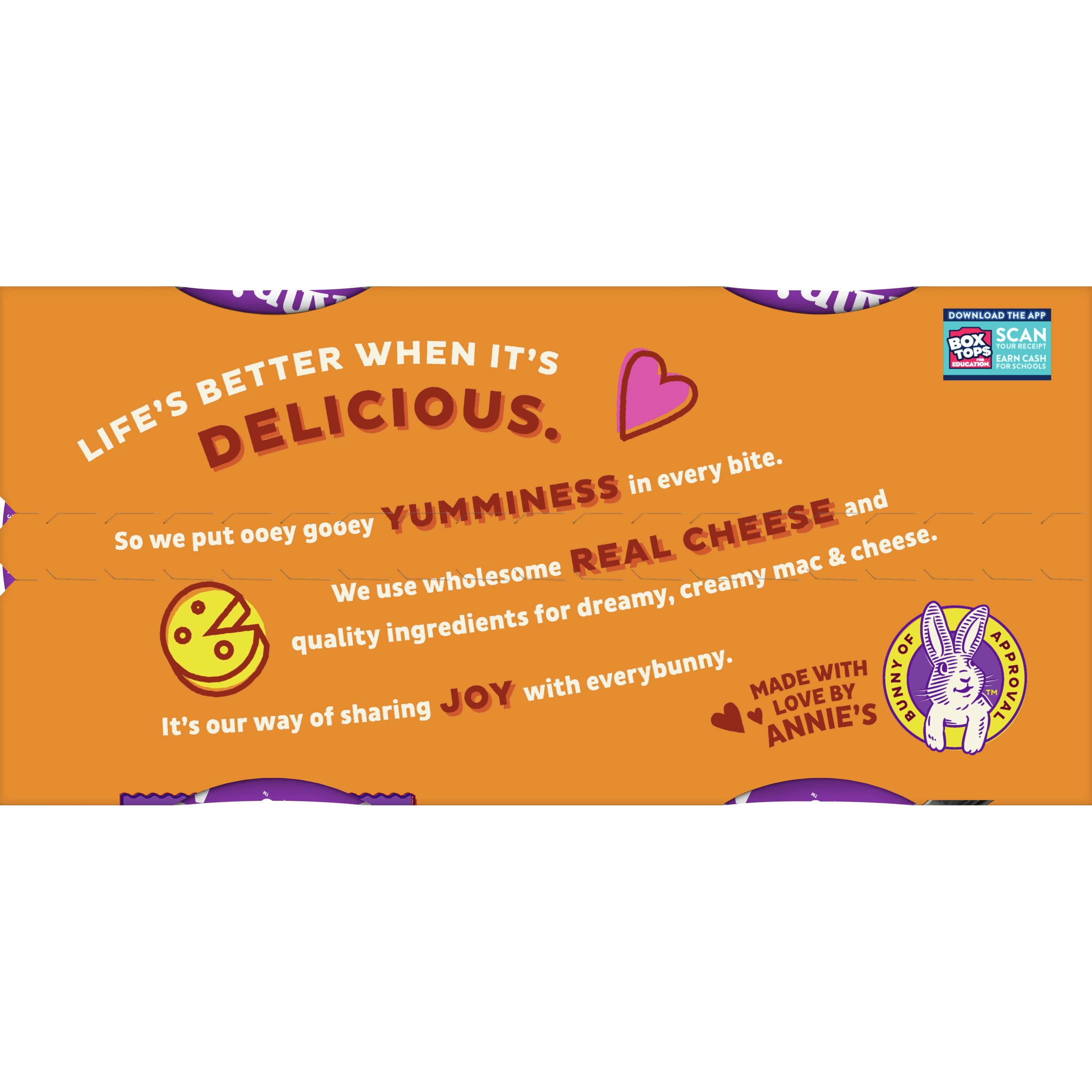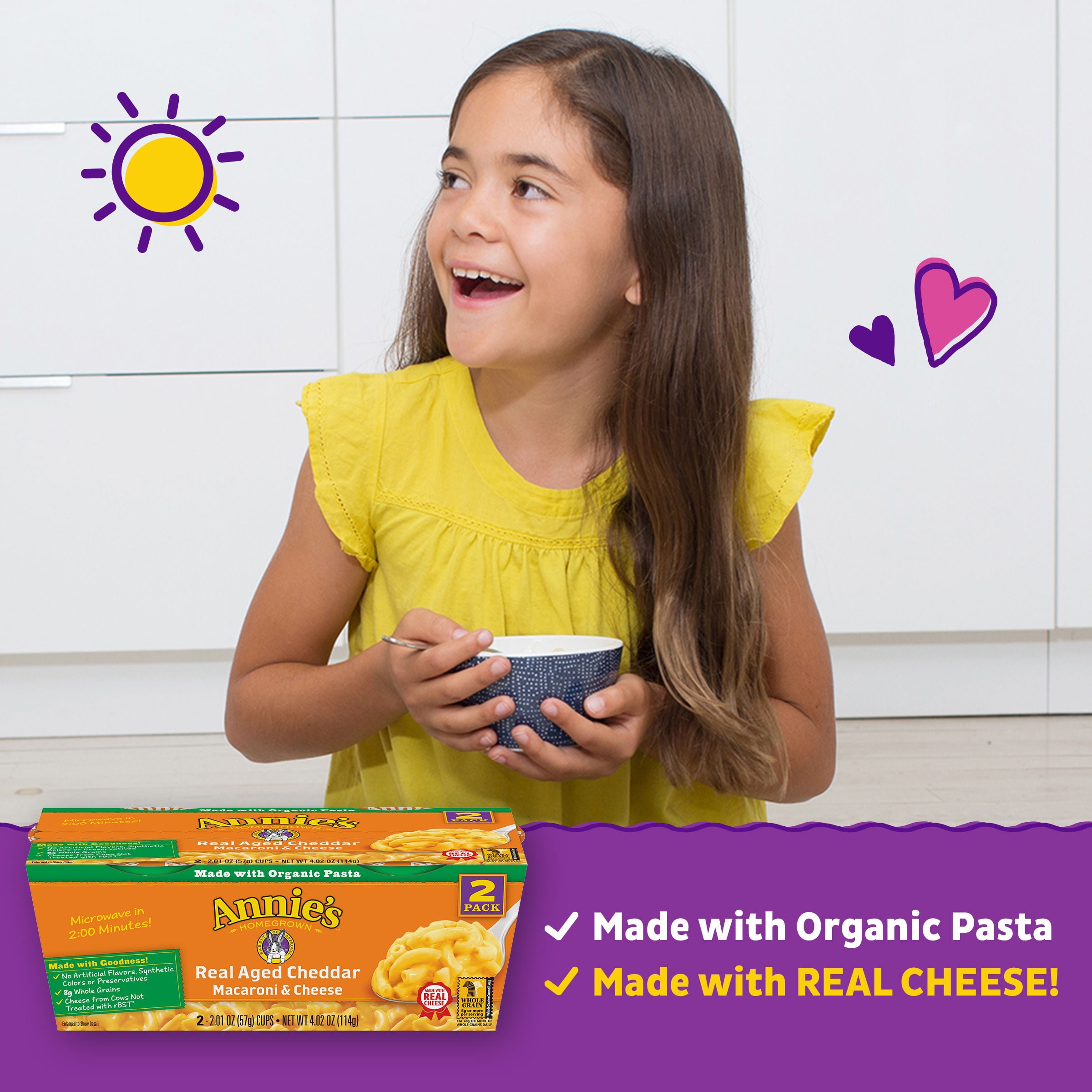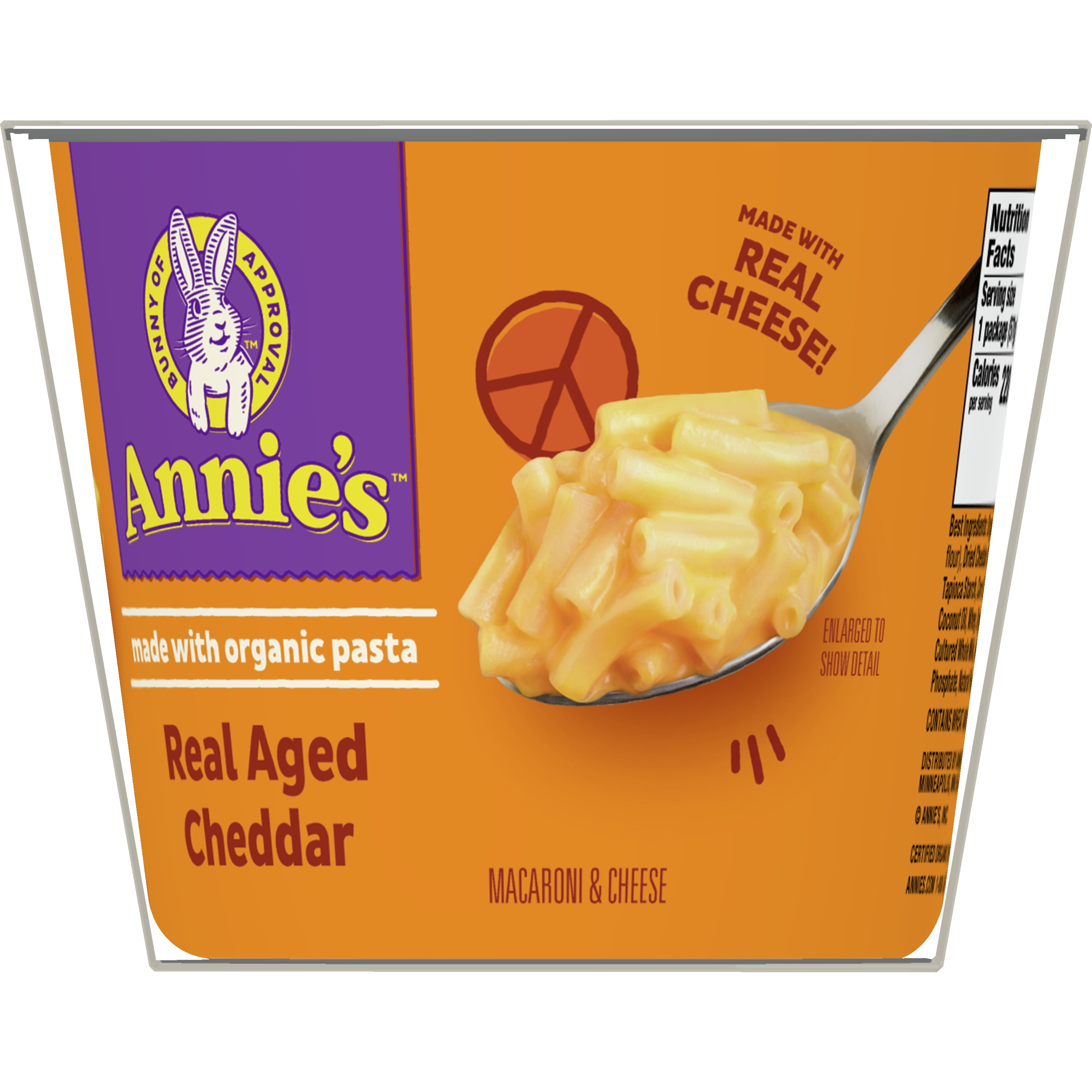 Annie’s Real Aged Cheddar Microwave Mac and Cheese Cups make family dinner and kids snack time easy and delicious. Each Annie’s mac and cheese cup offers organic pasta and flavorful aged cheddar cheese with a creamy, dreamy taste that is impossible to resist. Annie’s microwavable mac and cheese is crafted with care and made with real cheese from cows not treated with rBST*, offering quality ingredients in every cup. With no artificial flavors or synthetic colors, you can feel good about serving and enjoying a tasty and wholesome cup of Annie’s mac n cheese. Annie’s macaroni and cheese cups are perfect for lunchtime, dinnertime or anytime you’re in the mood for something downright delicious. These microwave mac and cheese cups are ready in minutes, making them a great-tasting adult and kids food option for busy bunnies and families on the go. Simply remove the cup lid, add cold water to the fill line and stir. Microwave on high for two minutes, mix in the cheese packet and enjoy alone or paired with a kid-friendly protein like chicken nuggets. This convenient adult and kids mac and cheese pack comes with two cups you can easily store in a pantry or throw into a backpack for an on-the-go snack. Annie’s macaroni and cheese is an official Box Tops For Education participating product. Download the Box Tops App to learn more and start earning cash for schools in need today. Annie’s Homegrown is devoted to spreading goodness through kindness to the planet and creating tasty foods for everybunny.*No significant difference has been shown between milk derived from rBST-treated and non rBST-treated cows.