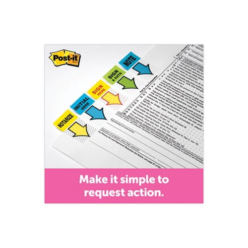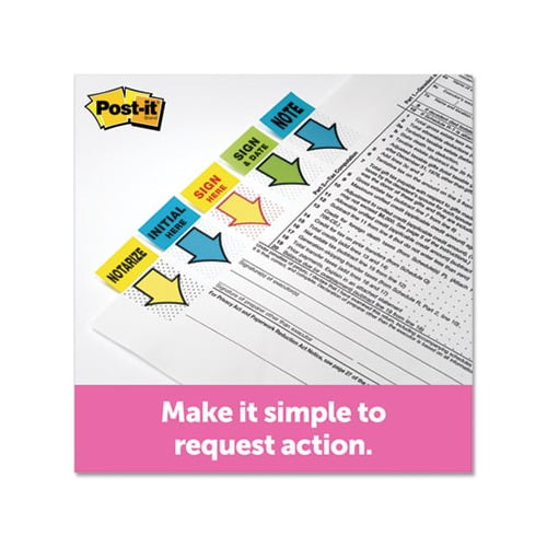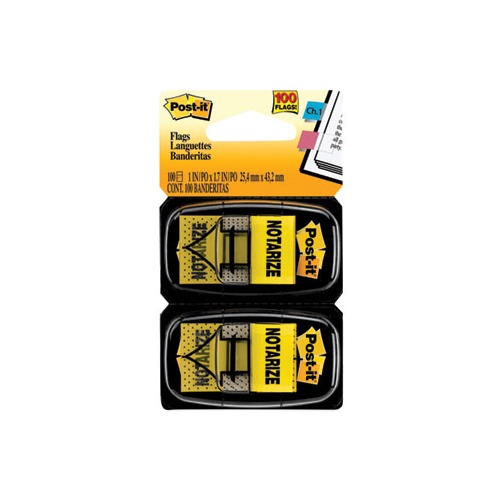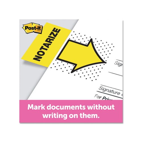 Post-it 1" Wide Arrow Message Flags help you make sure that you don’t miss anyone on your signatory list. Flags stick securely and remove cleanly without damaging your document. Included pack-style dispensers work great alone or can be incorporated into a larger desktop organization system. Colors: Yellow Color Family: Yellow Messages: NOTARIZE Dispenser: Pop-Up.