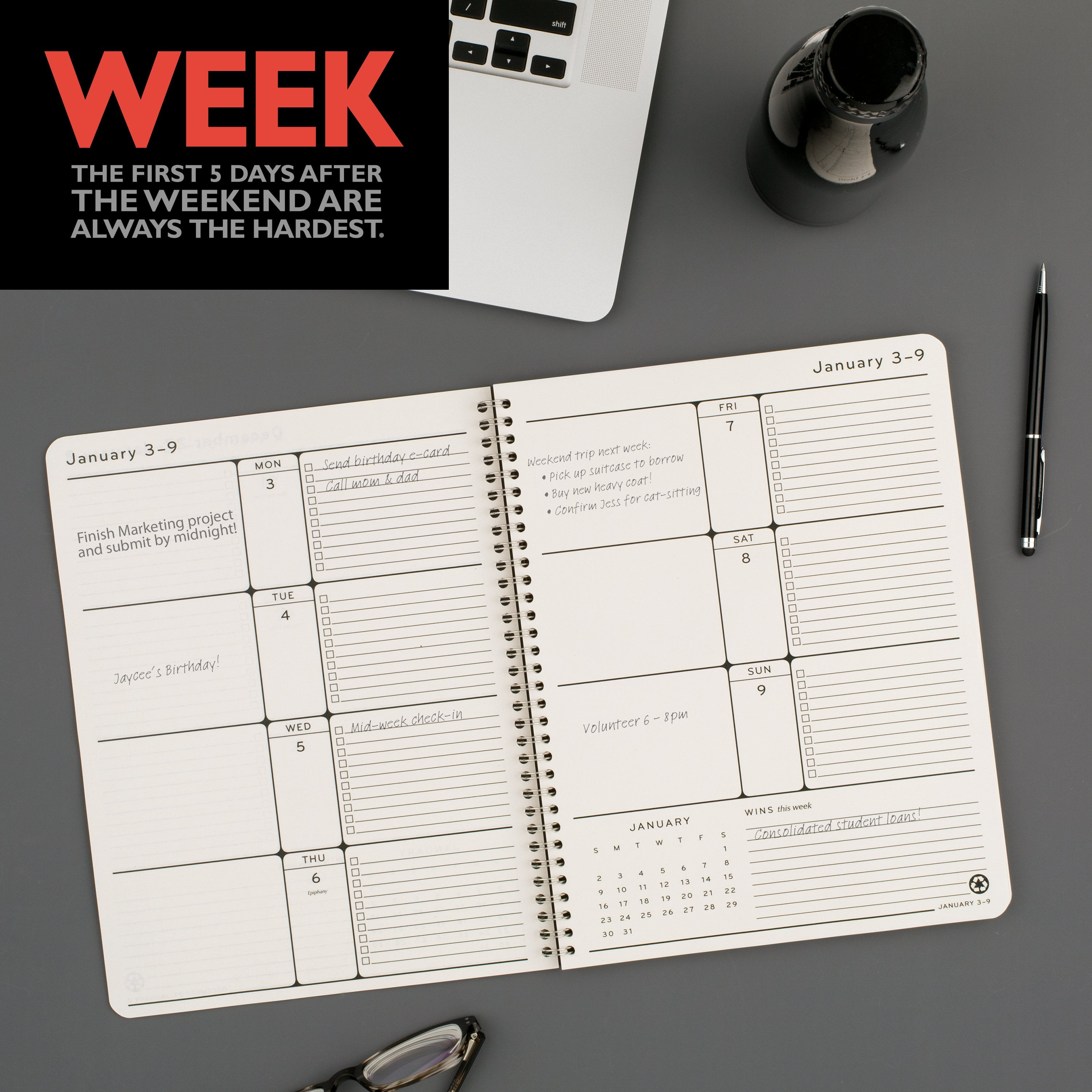 - Free your mind and track all your plans, goals, achievements and more on the unique weekly and monthly spreads