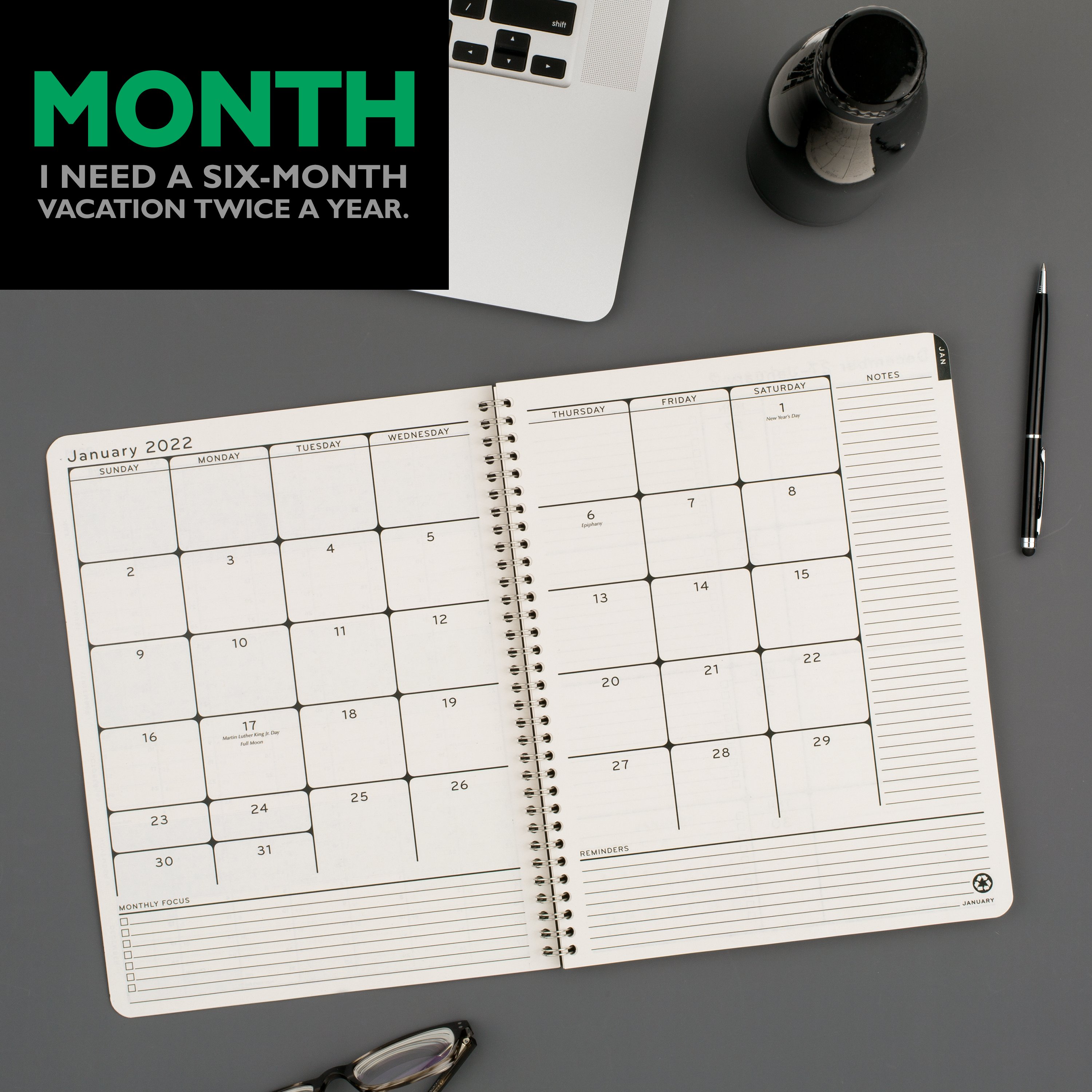 - Plan your schedule for the entire year with pages that go from January 2022 – December 2022