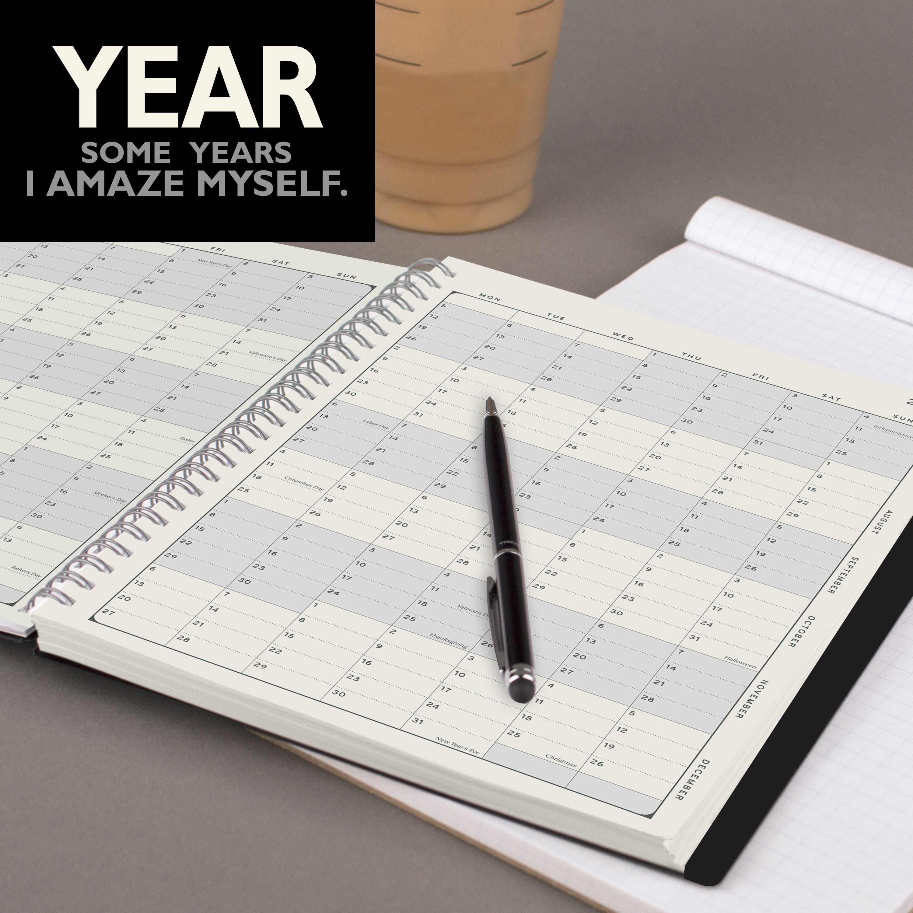 Own your schedule and get going with a new planner. Stay organized while protecting the environment. Made only with vegetable based inks and recycled paper. At the end of the year, simply recycle the planner. The durable paper cover and sturdy twin wire binding will hold up to the chaos.