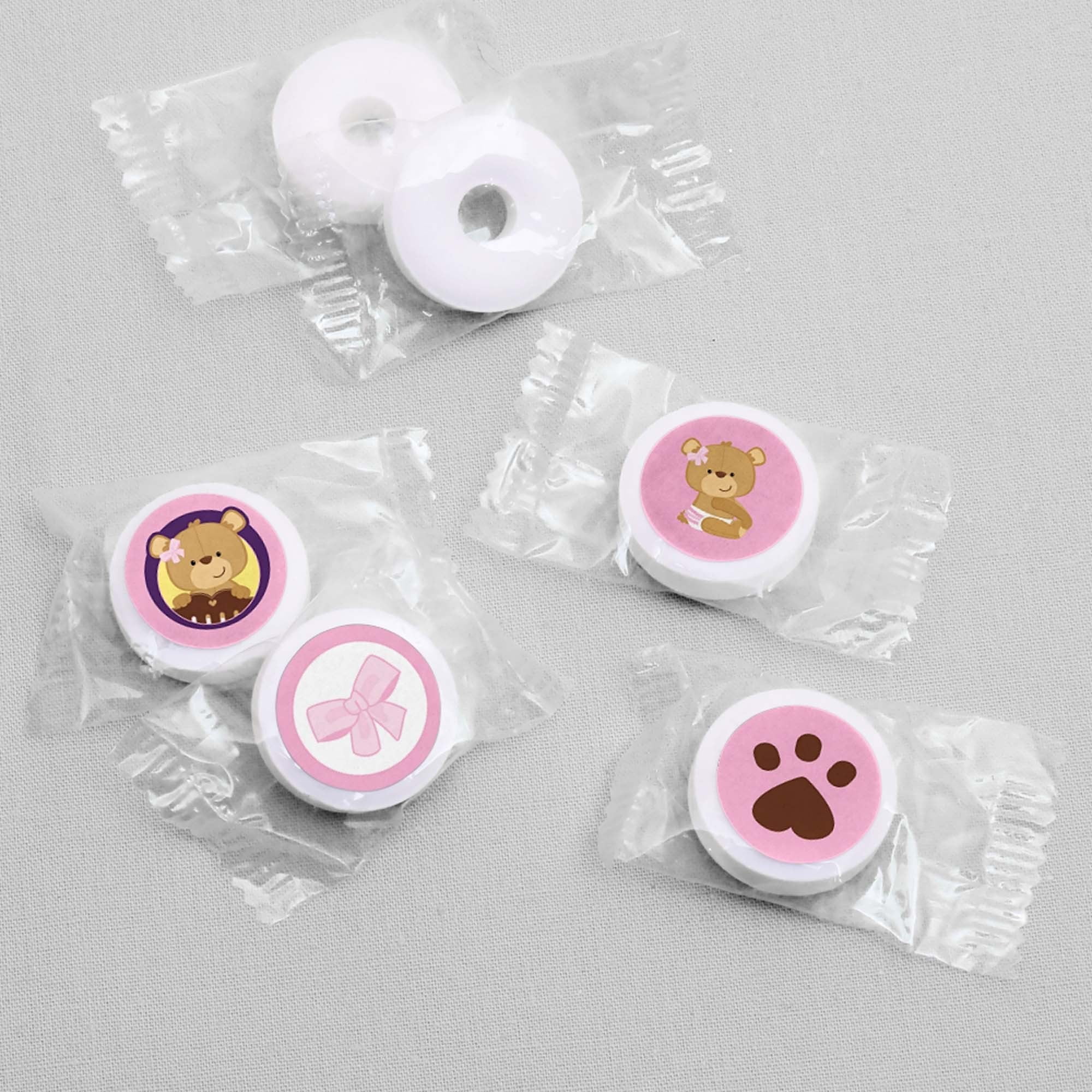 - EASY PARTY DECORATIONS: Baby Girl Teddy Bear round candy sticker labels are an easy party decoration to add to your list of party supplies. Scatter decorated candies down your dining tables, package in small gift bags as a party favor, or display in a pretty bowl at your candy buffet. Get creative with your pink and brown baby bear DIY baby shower or birthday party decoration ideas!