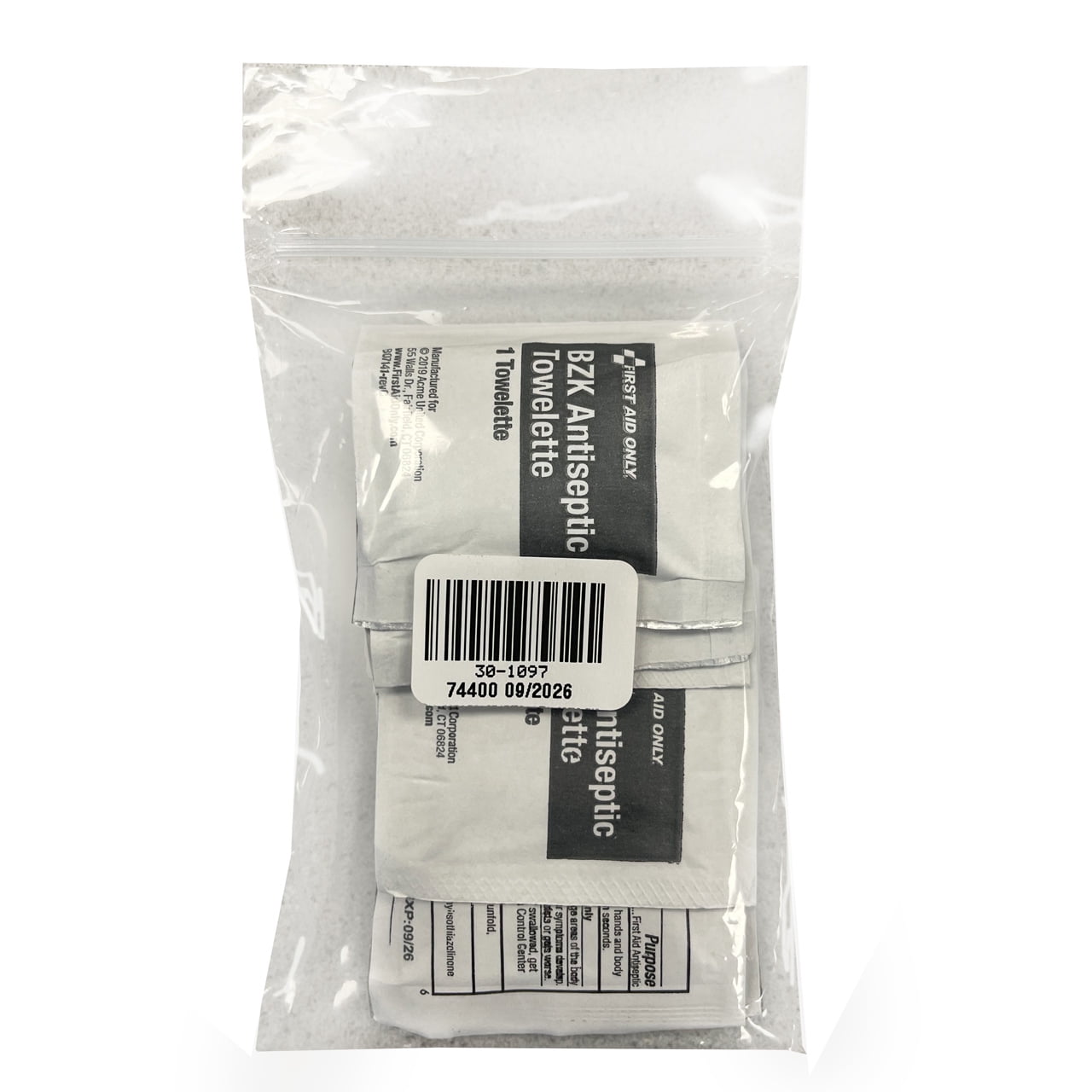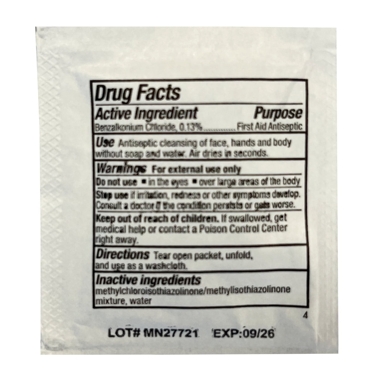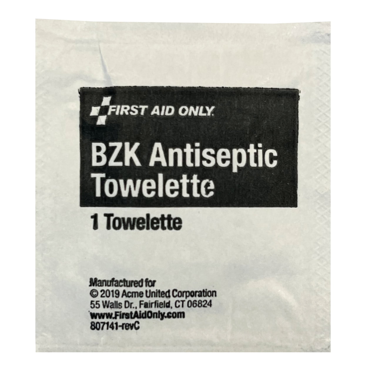 - Ten Benzalkonium Chloride Antiseptic Towelettes in a resealable bag. Weight: 1.76 oz