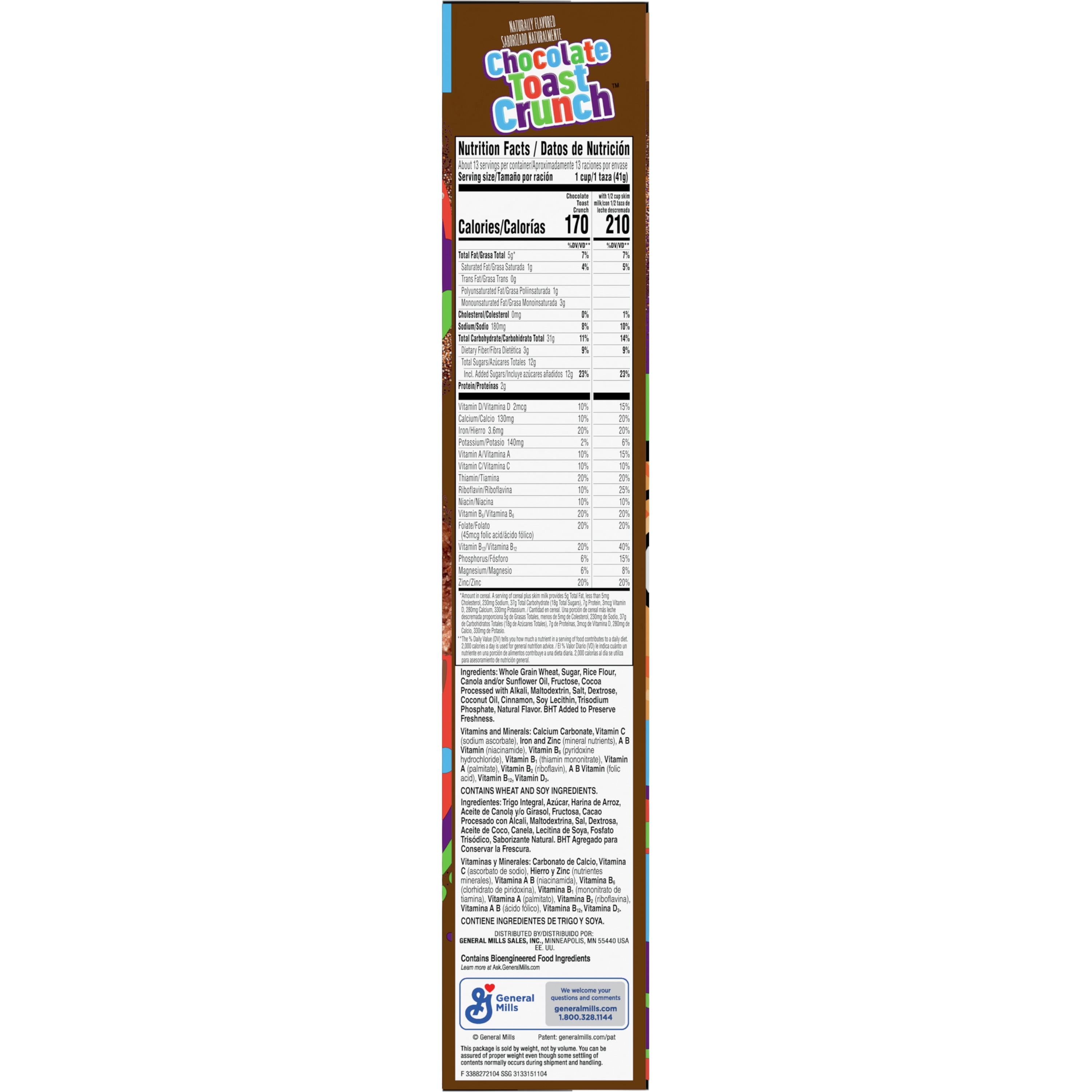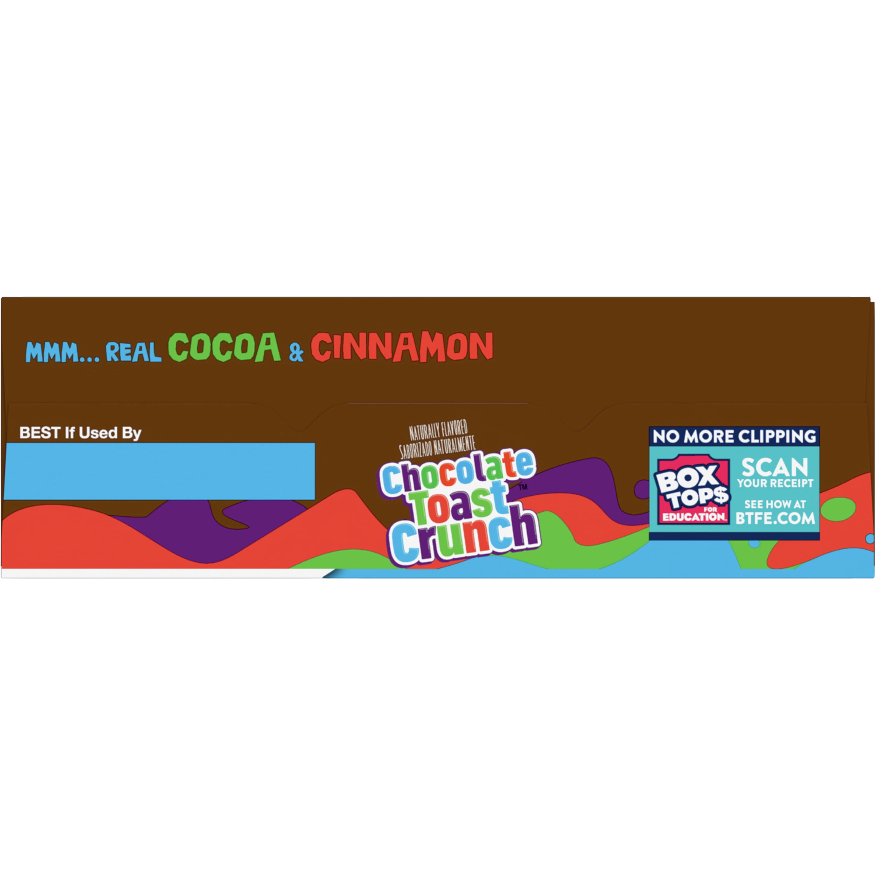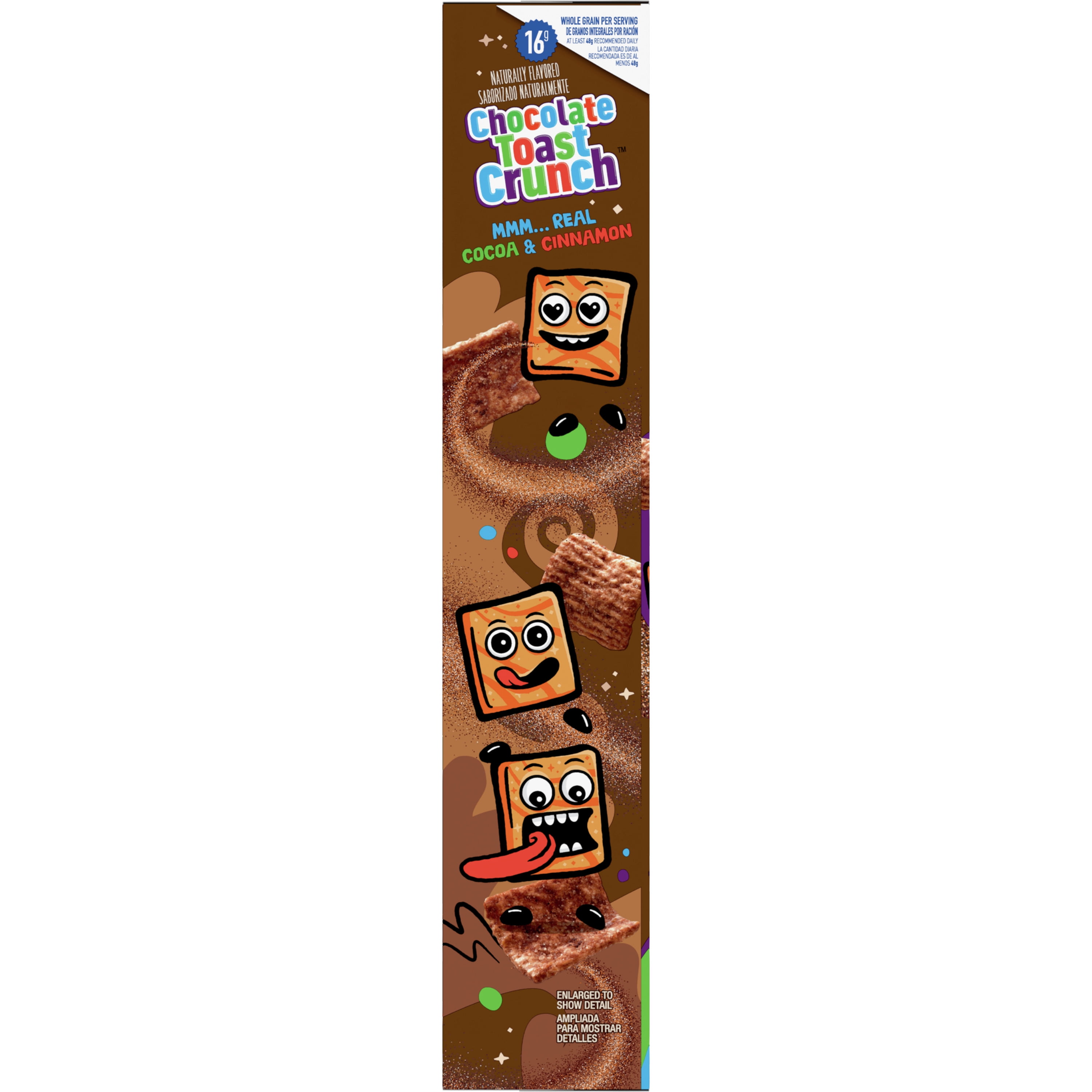 - One 19.5 oz Family Size cereal box of General Mills Chocolate Toast Crunch Breakfast Cereal