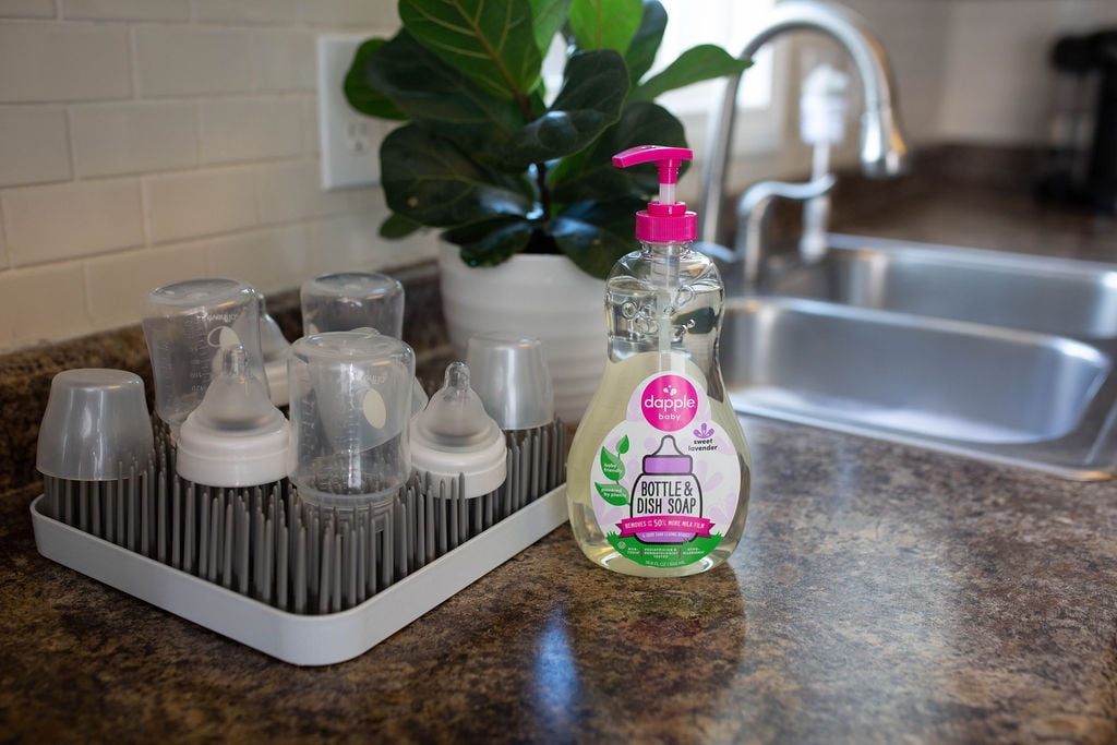 Pure, clean, and extremely powerful… it’s got everything but the kitchen sink. Dapple Baby Bottle and Dish Soap is a pure, clean, and extremely powerful way to effectively clean bottles, sippy cups, pacifiers, and breast pump components. It is designed with award-winning Green Technology that uses plant-based ingredients and baking soda to target messes like milk residue and odor. Our formula is made without phthalates, parabens, SLS, SLES, artificial fragrances, or dyes. Our products are also put through rigorous performance testing to ensure the things your baby uses on a daily basis are effectively washed every time. A consistently clean rinse is one of the many reasons you can count on Dapple Baby Bottle and Dish Soap – everything you want, nothing you don’t.