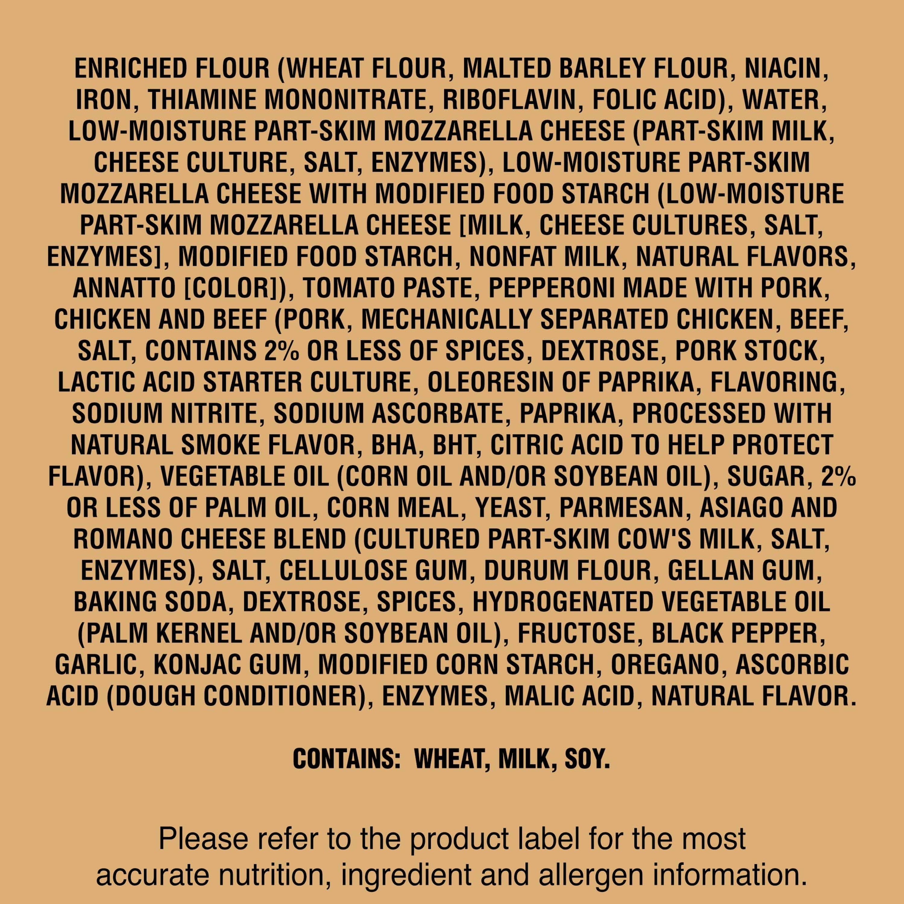 DiGiorno Pepperoni Frozen Personal Pizza on a Hand-Tossed Style Traditional Crust is created with the same great taste you love, but in a smaller size so you don’t have to share. This small pizza is topped with tasty pepperoni and made with real mozzarella cheese, delivering a delicious, easy dinner. DiGiorno hand-tossed style pizza crust is a traditional favorite because it’s crispy yet soft and airy on the inside for a truly satisfying personal pizza. Plus, this microwave pizza features a new and improved, tastier crust. This frozen pepperoni pizza is made with real cheese, pepperoni made from pork, chicken, and beef, and contains 27 grams of protein. Enjoy a quick lunch or dinner with a small frozen pizza just for you, straight from your oven. This small pizza is also great in an air fryer. Keep this DiGiorno pepperoni pizza frozen until you’re ready to enjoy. It’s not delivery. It’s DiGiorno.
