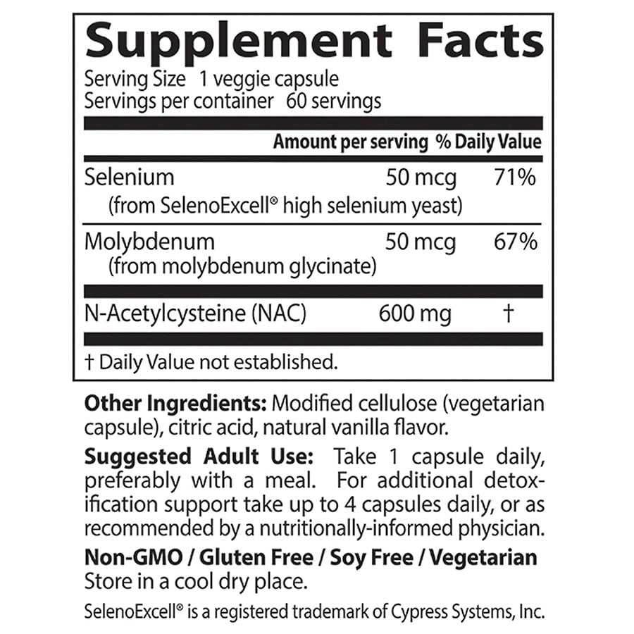 Dietary Supplement Science-Based Nutrition Helps support cellular health and liver function* SelenoExcell . High Selenium Supplement Helps support glutathione production in the brain, liver and other organs* Helps support enzymes that neutralize natural and manmade toxins* Helps support healthy liver function* Non-GMO / Gluten Free / Soy Free / Vegetarian Doctor’s Best NAC Detox Regulators support the production and utilization of glutathione, the foremost protective and regulatory antioxidant naturally concentrated in all healthy cells.* NAC (N-Acetylcysteine) is proven to support glutathione production.* Selenium and molybdenum are essential for facilitating glutathione’s role in supporting energy production, detoxification and other fundamental life processes. SelenoExcell is a registered trademark of Cypress Systems, Inc. (800) 777-2474 *These statements have not been evaluated by the Food and Drug Administration. This product is not intended to diagnose, treat, cure or prevent any disease.Made in United States Suggested Adult Use: Take 1 capsules twice daily with food or as recommended by a nutritionally-informed physician. Store in a cool, dry place. ?Doctor’s Best, IncDoctor’s Best – Nac Detox Regulators – 1 Each-60 Vcap