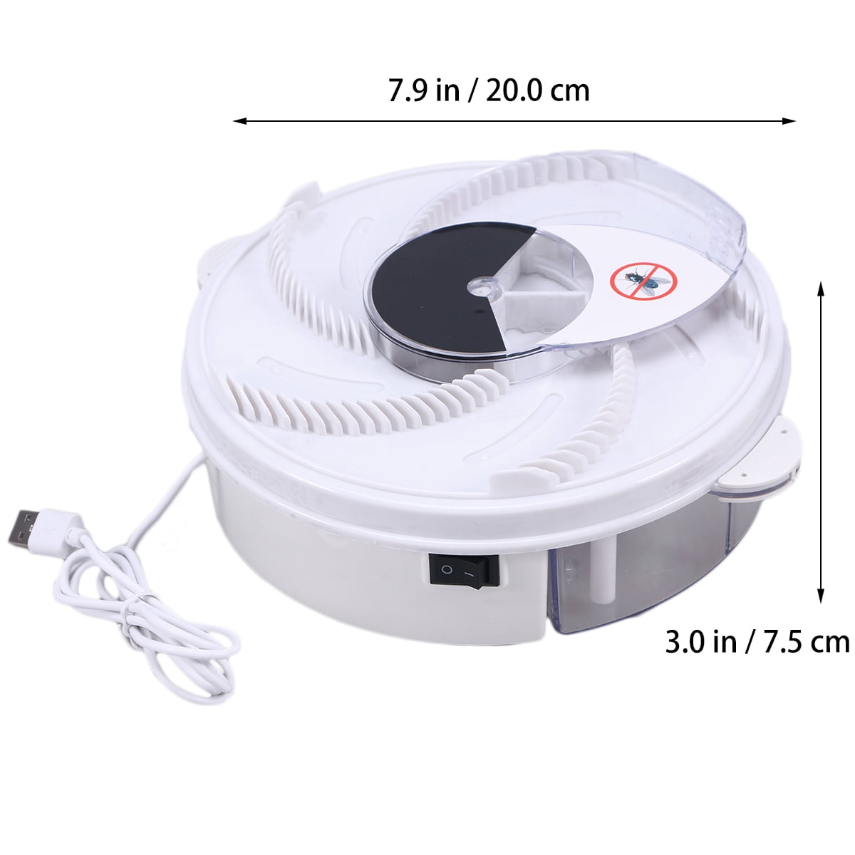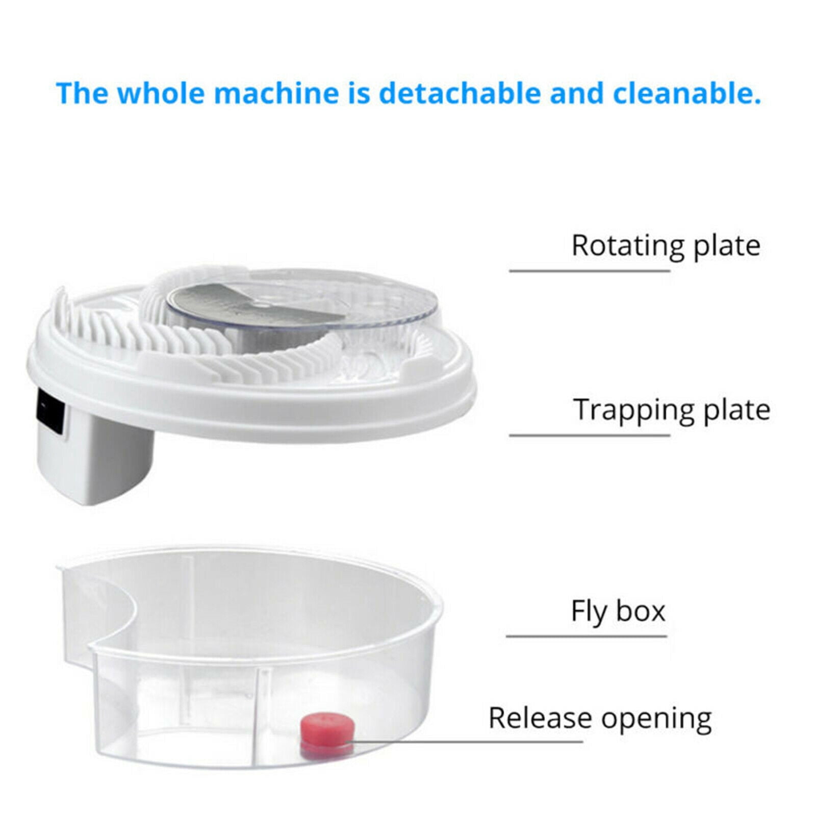 - How to use: Put flies lures on the catcher to induce the flies, then turn on the switch, and the upper plate will rotate. When flies are induced and land on the plate, they will gradually and slowly being trapped into the bottom box.