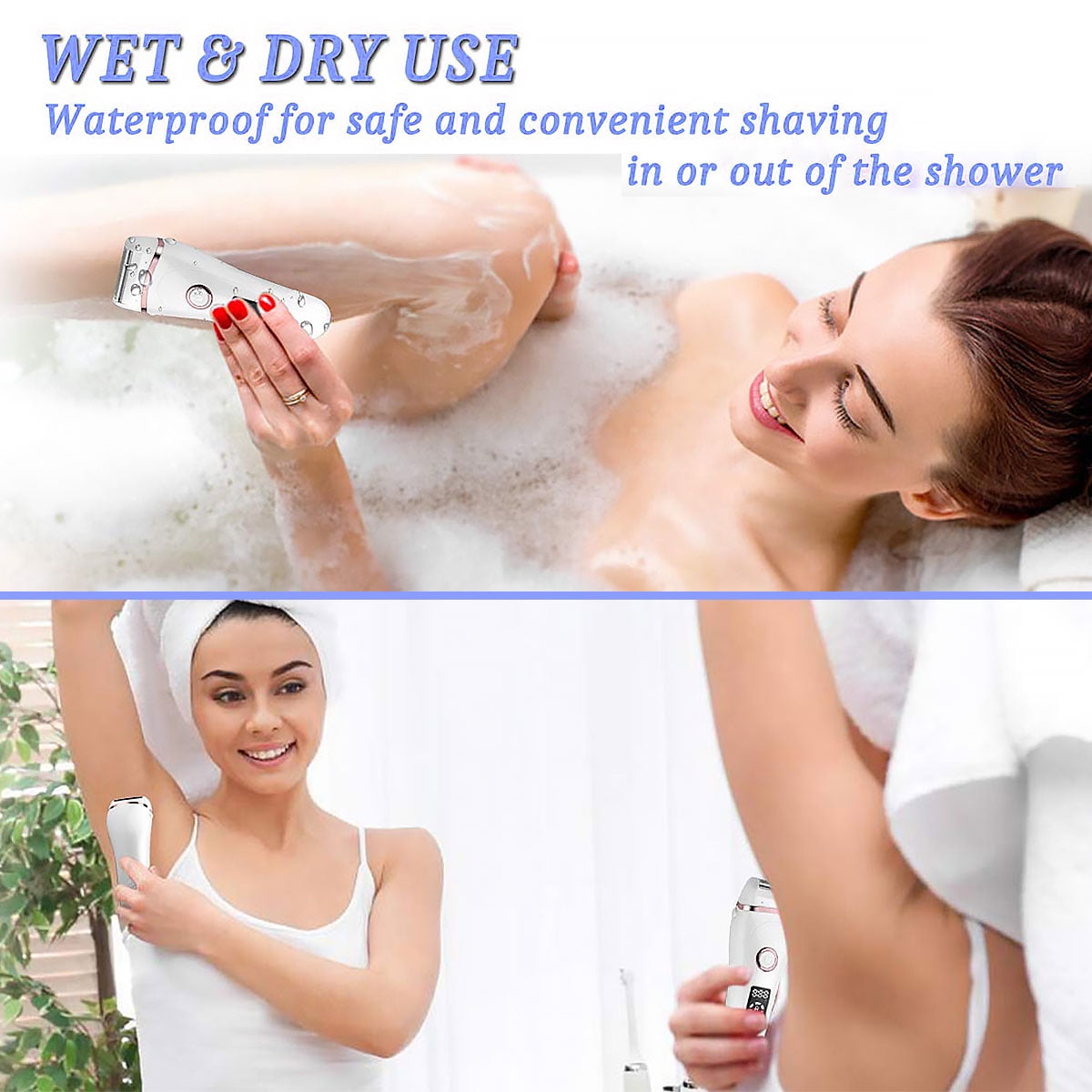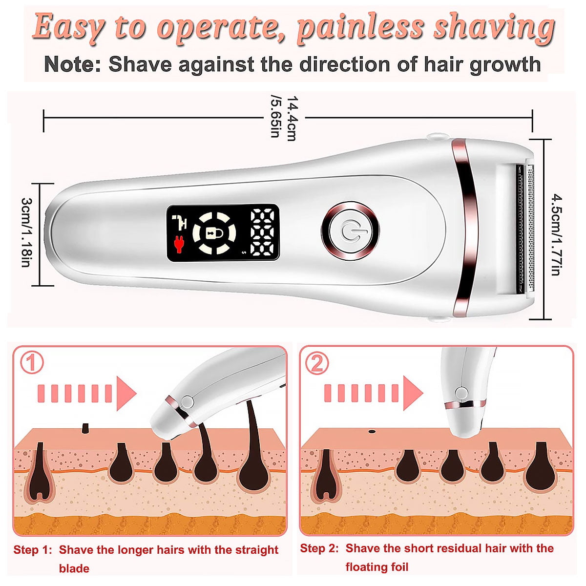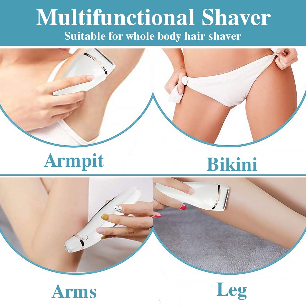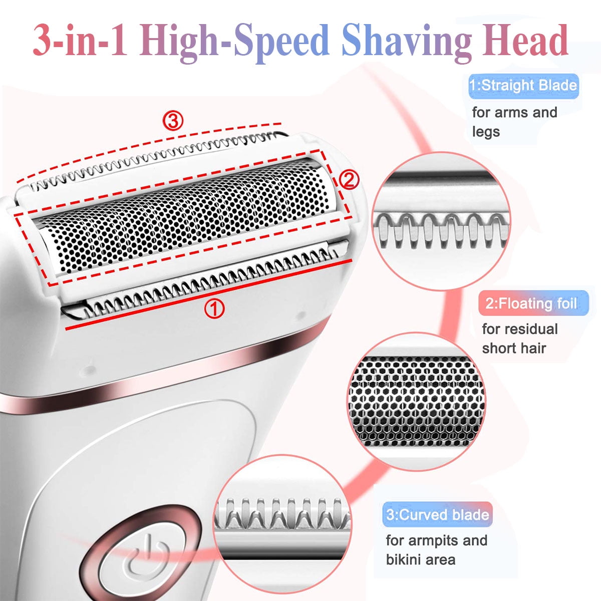 TiokMc Women Electric Shaver Can easily remove hair from your arms, legs, body, armpits and bikini area instead of using waxing, hair remover cream or pluck. 3 in 1 Professional Precision Blades,bikini trimmer adopts 3 high-speed super-thin blades. Straight blade works well on arms & legs; Curved blade works well on armpit/underarms, bikini lines and other hard-to-reach areas; Floating foil works best for trimming stubble to ensure safe but safe shave,Softly, gently but quickly remover hair, no more redness, pain or irritation, providing long-lasting smooth skin.