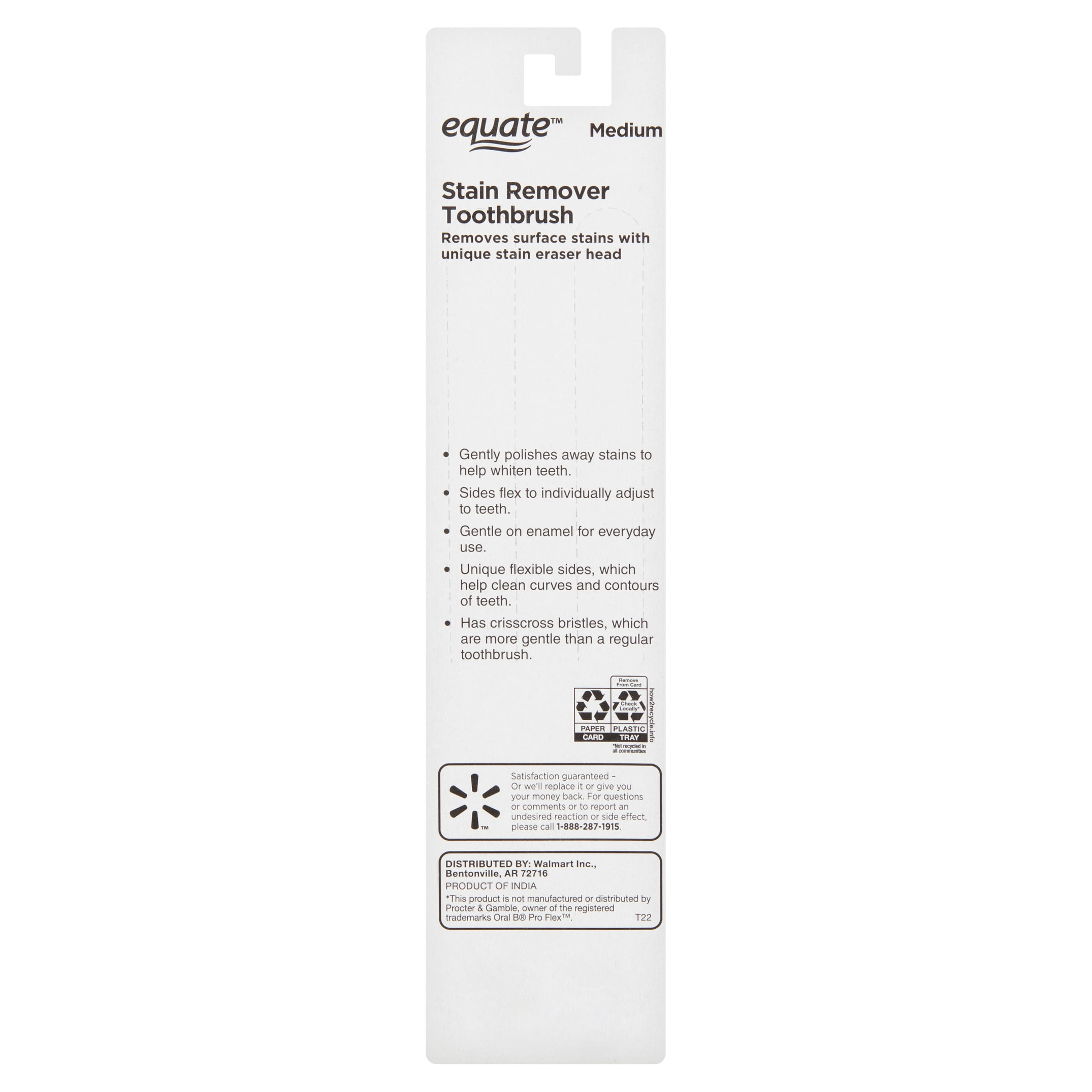 The equate Stain Remover Adult Medium Manual Toothbrush has a unique stain eraser head that removes surface stains from your teeth for a whiter smile. The flexible sides of the toothbrush help clean the curves and contours of your teeth while remaining gentler on your gums than a regular toothbrush. The equate Stain Remover Toothbrush is gentle enough for everyday use, but tough on stains for that white smile you are looking for.
