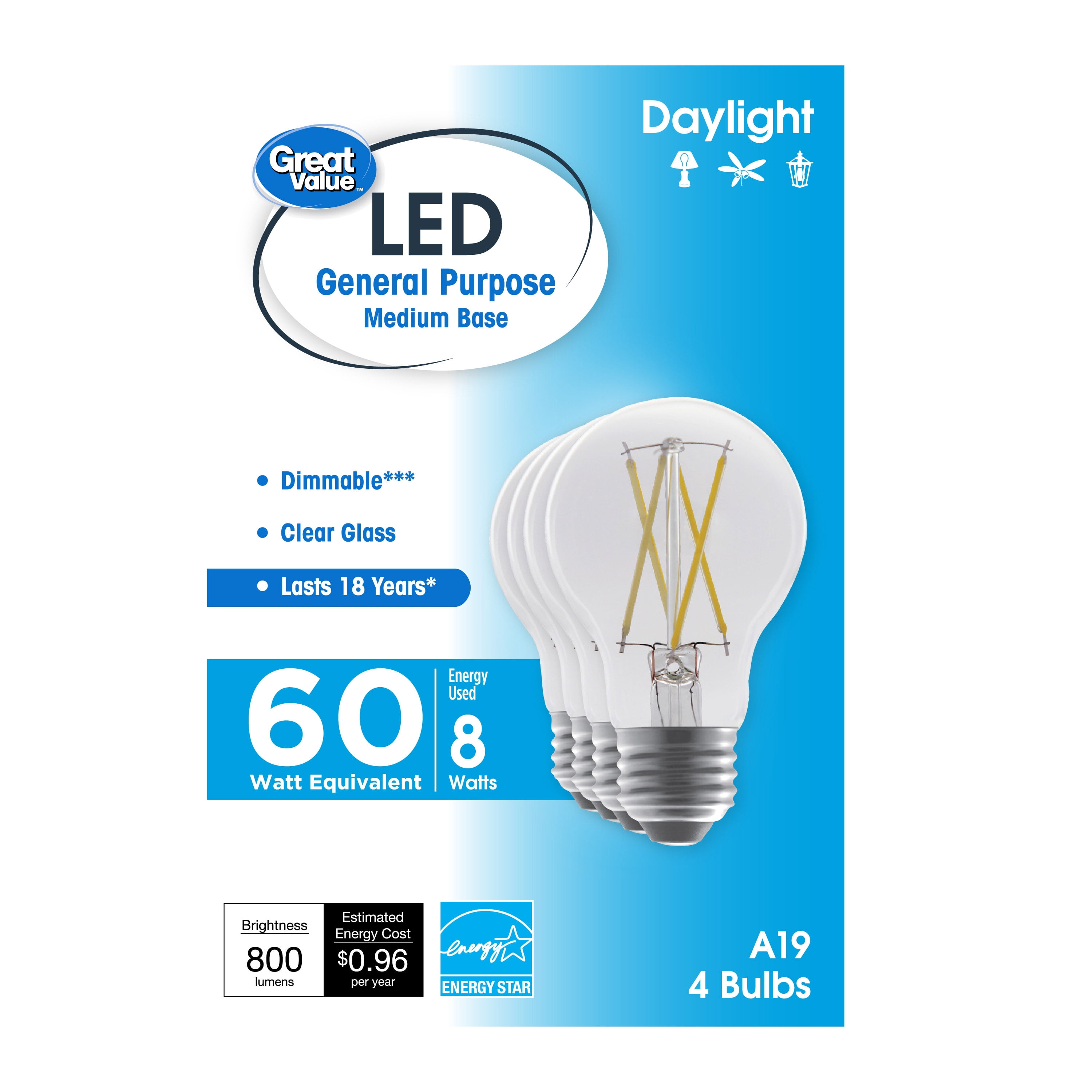 Great Value 18 Year LED Light Bulbs, A19 60 Watts Equivalent, 8 Watts Efficient, Dimmable, Daylight Clear Glass, 4 Pack