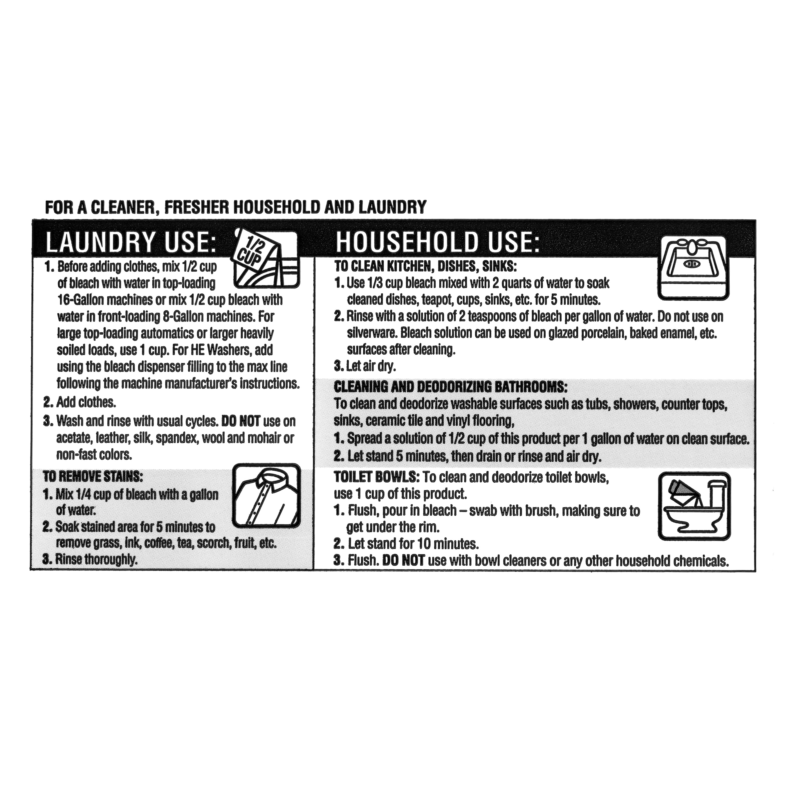 Great Value Low-Splash Concentrated Bleach is great for a cleaner, fresher household and laundry. It is designed to work with most standard HE washers and will keep your whites bright as it fights tough to remove stains. It is also effective for cleaning common household surfaces such as bathrooms, kitchen surfaces, dishes and sinks. This bleach is also effective in cleaning and deodorizing pre cleaned toilet bowls. Clean away the messes and keep your home clean and deodorized with Great Value Low Splash Concentrated Bleach.