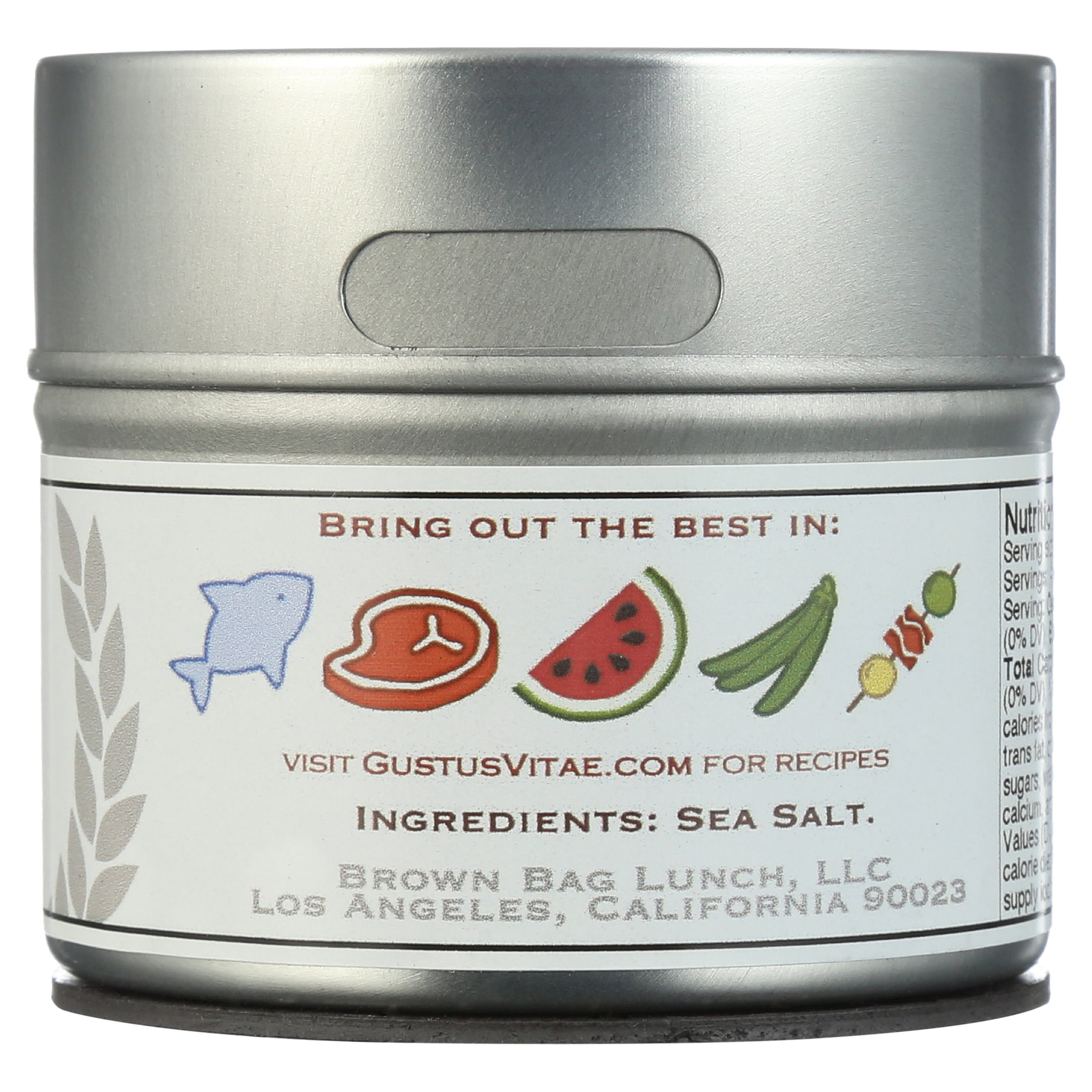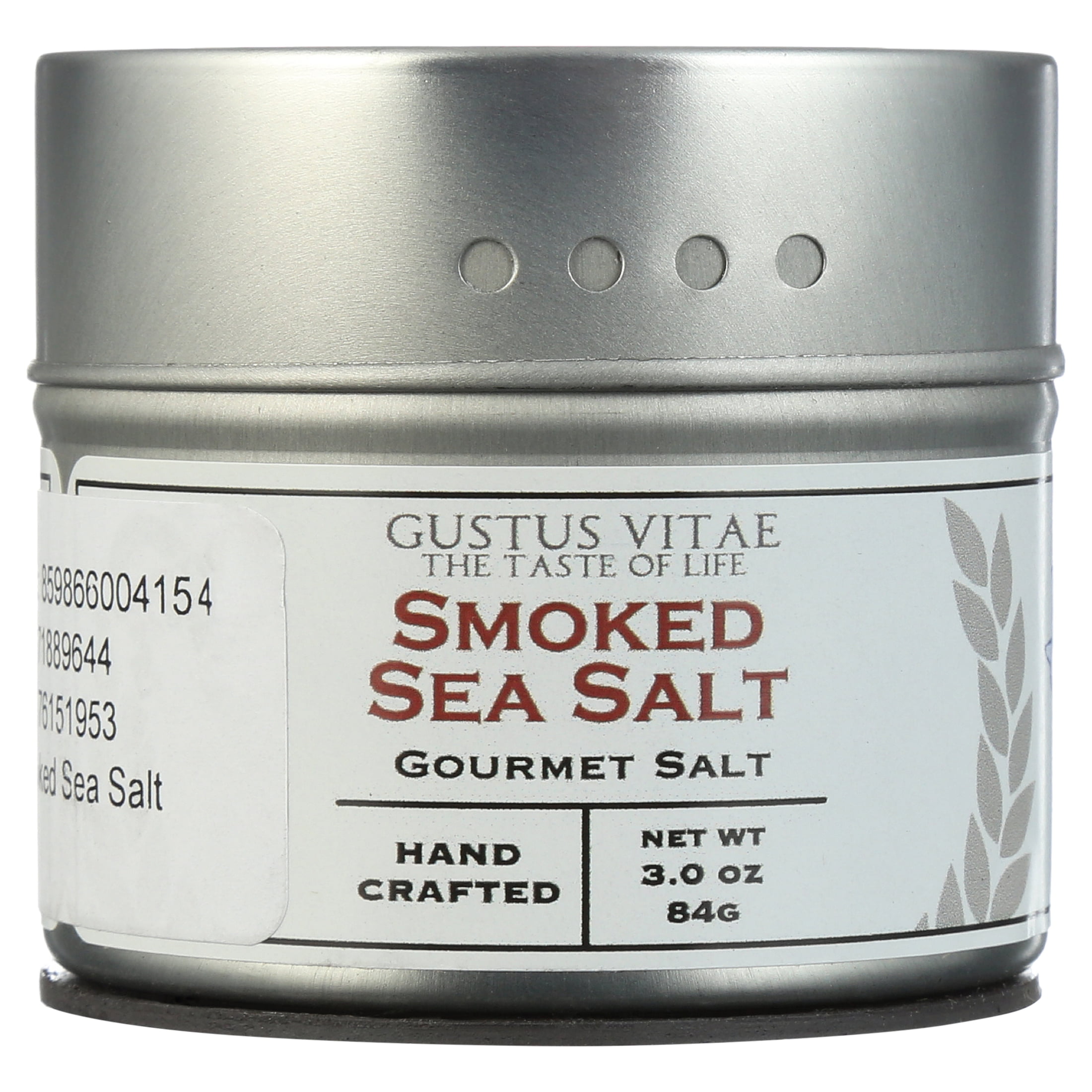 Gustus Vite’s Smoked Sea Salt, 1 Magnetic Shaker tin Deep Alderwood smoke flavor and a mottled mahogany color define our Natural Smoked Sea Salt. Utilize its remarkably savory flavor on chicken, pork, potatoes, burgers, and add real depth to foods cooked on gas-fired grills. Its sparkling hazel color makes our Natural Smoked Sea Salt a beautiful finishing salt: sprinkle on foods just before serving for full-bodied flavor and a dappled luster. 3.0 oz (84g) net wt. Non-GMO certified. Magnetized backing: sticks to your fridge or other metal surface. Crafted in small batches. Hand packed in California from local and imported ingredients. Not irradiated or treated with EtO gas. All natural: free from artificial colors and flavors. No nuts, soy, dairy, sugar, or gluten.Sprinkle on for toasty color and a rich smoky flavor. Deep Alderwood smoke flavor and a mottled mahogany color define our Natural Smoked Sea Salt. 3.0 oz (84g) net wt. Non-GMO certified. Magnetized backing: sticks to your fridge or other metal surface. Crafted in small batches. Hand packed in California from local and imported ingredients. Not irradiated or treated with EtO gas. All natural: free from artificial colors and flavors. No nuts, soy, dairy, sugar, or gluten.