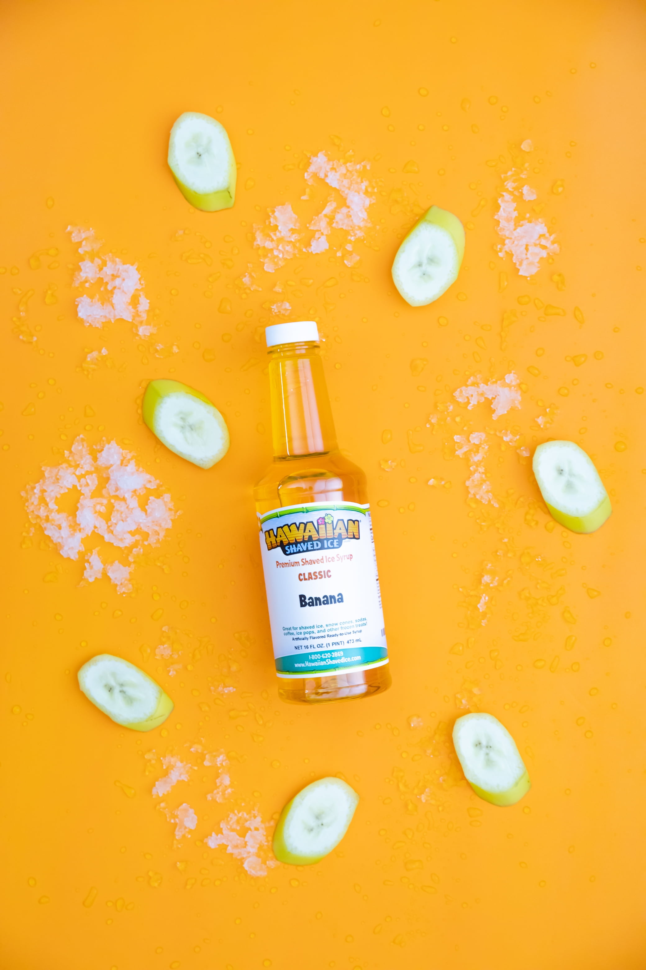 Our premium banana snow cone syrup is the perfect addition to a fresh cup of shaved ice! This refreshing, icy treat is just what is needed to complete any summer celebration – pool parties, lake days, birthday parties, carnivals, and more. Pair a pint of banana shaved ice syrup with a home-use machine and make the same delicious snowballs you would get at the fair or carnival from home in a matter of minutes. Syrups made by Hawaiian Shaved Ice are thicker, more true to taste than other watered-down, cheaper varieties. Our syrups are made with the finest ingredients and no expense is spared!
