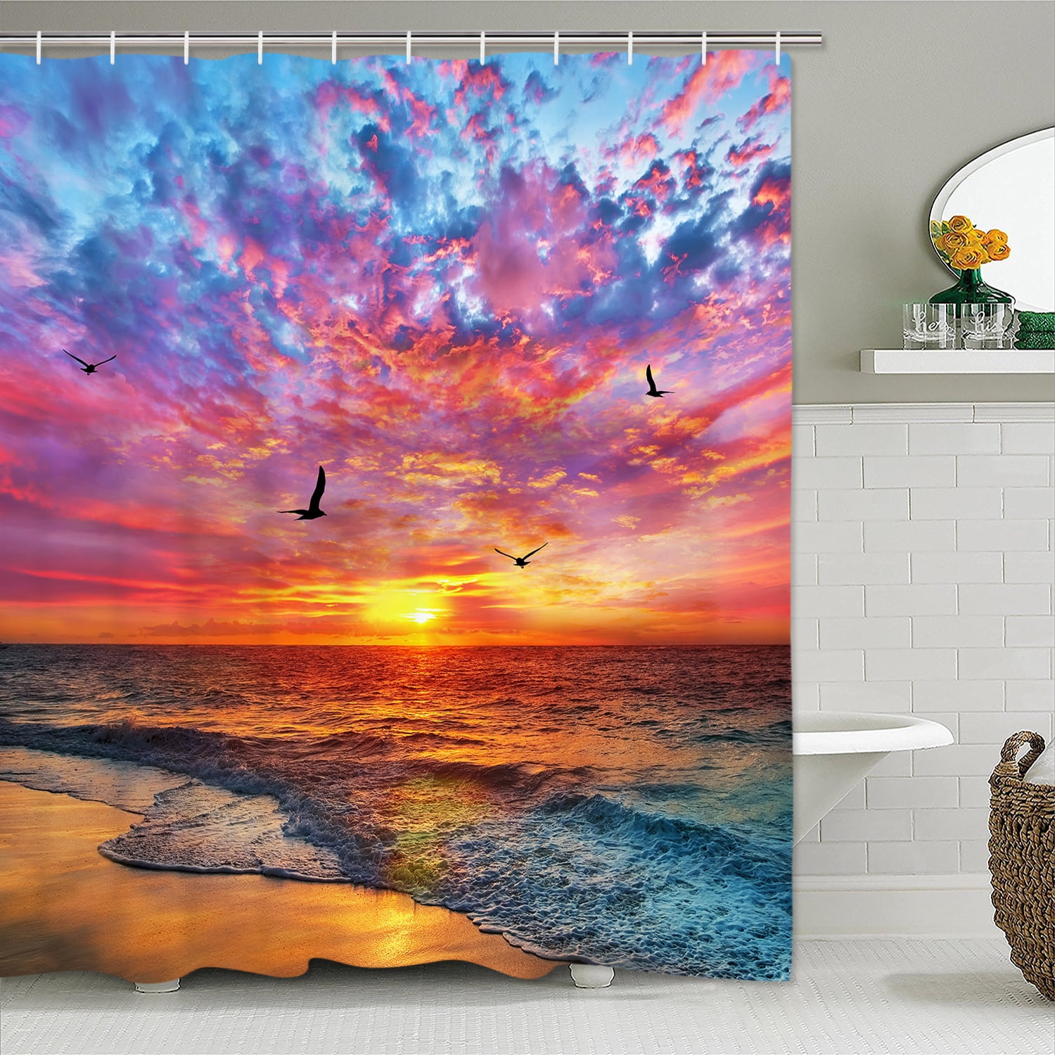 Ikfashoni Beach Sunset Shower Curtain, Blue Sky Ocean Waterproof Shower Curtains for Bathroom,Tropical Coastal Bath Curtains,70’X69′