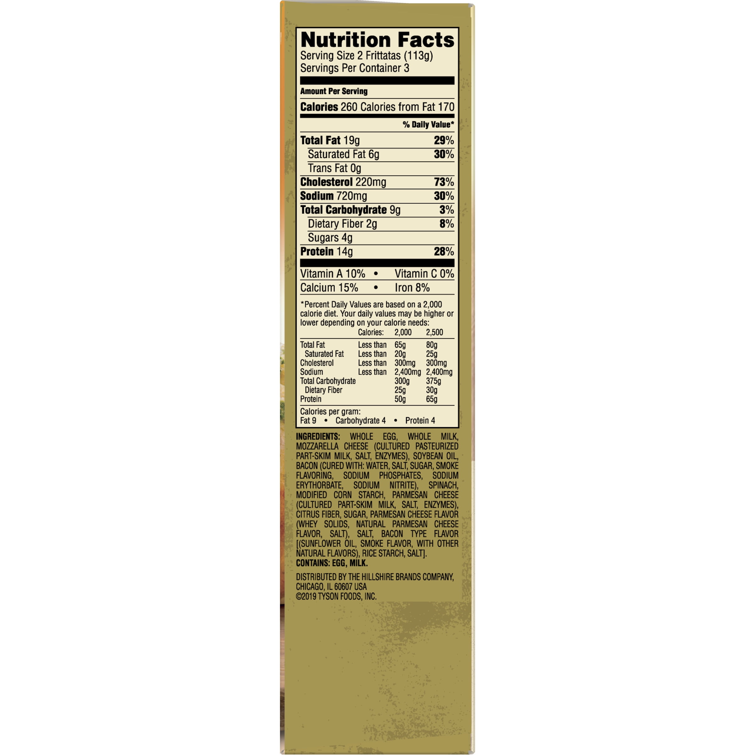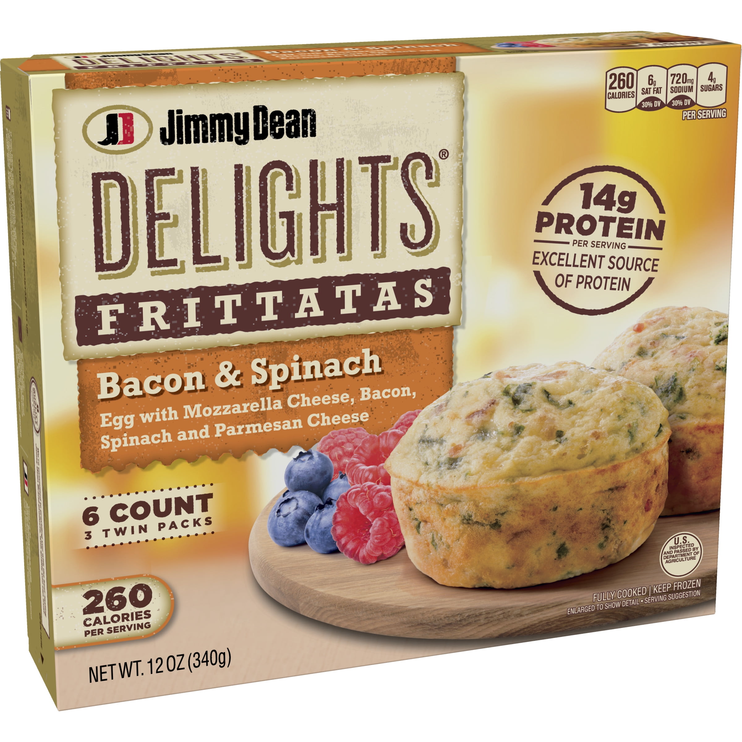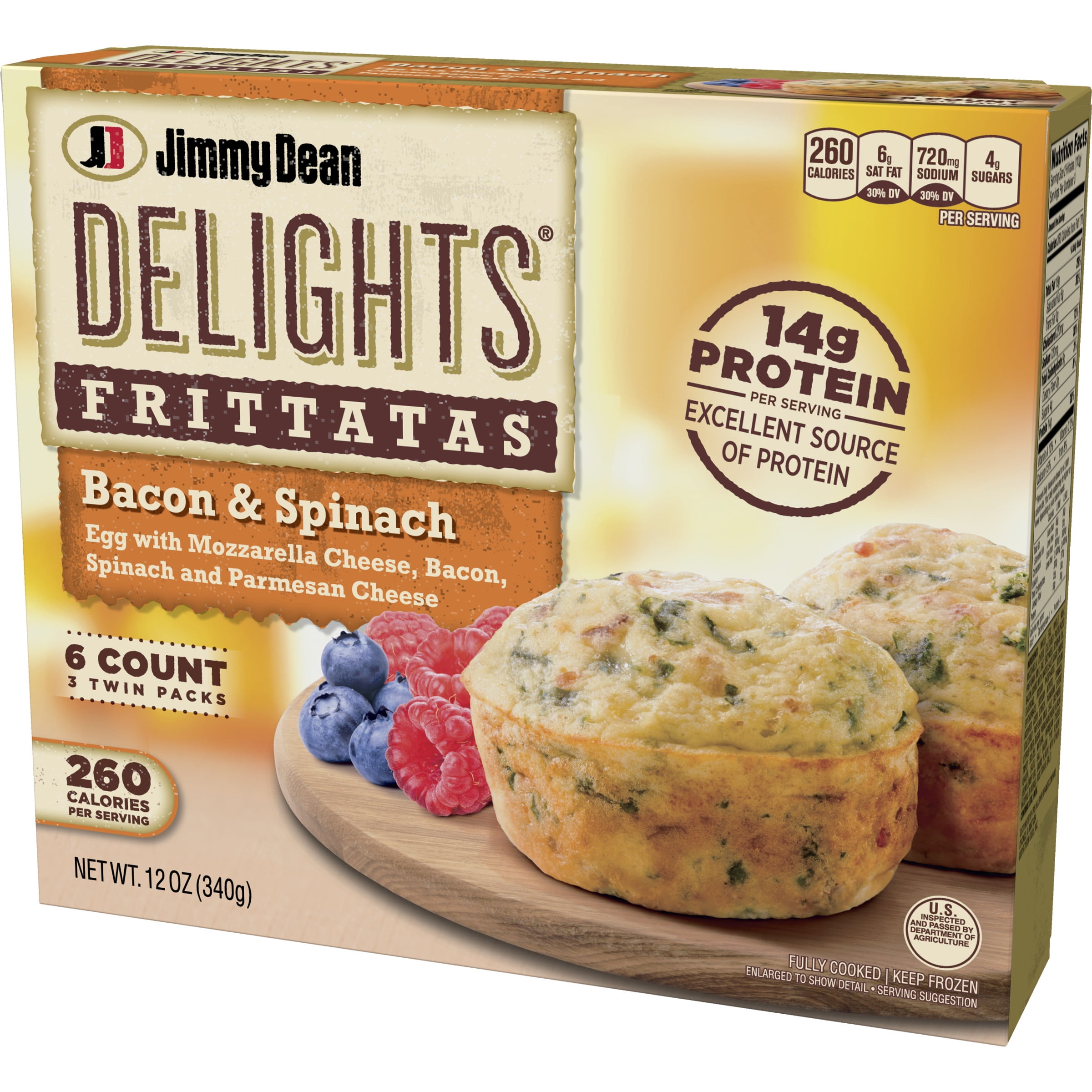 Give more power to your mornings without all of the bread and carbs! Jimmy Dean Delights Bacon & Spinach Frittatas are packed with crispy bacon, spinach and real mozzarella and parmesan cheese, all in a fluffy egg muffin for delicious quick breakfast ideas at home or on the go. Just like having a fast and ready breakfast quiche! With 14 grams of protein per serving, it’s the perfect protein packed frozen breakfast option for your morning routine. Simple to prepare and ready in minutes, this frittata is made with premium ingredients and the Jimmy Dean quality you know and trust. Jimmy Dean once said, "Sausage is a great deal like life. You get out of it what you put in." That pretty much sums up his magic formula for having a great day. The Jimmy Dean brand brings you many ways to add some sunshine to your morning. Because today is your day to shine on.QUESTION: This is not a sausage product, so should we have a sausage quote?