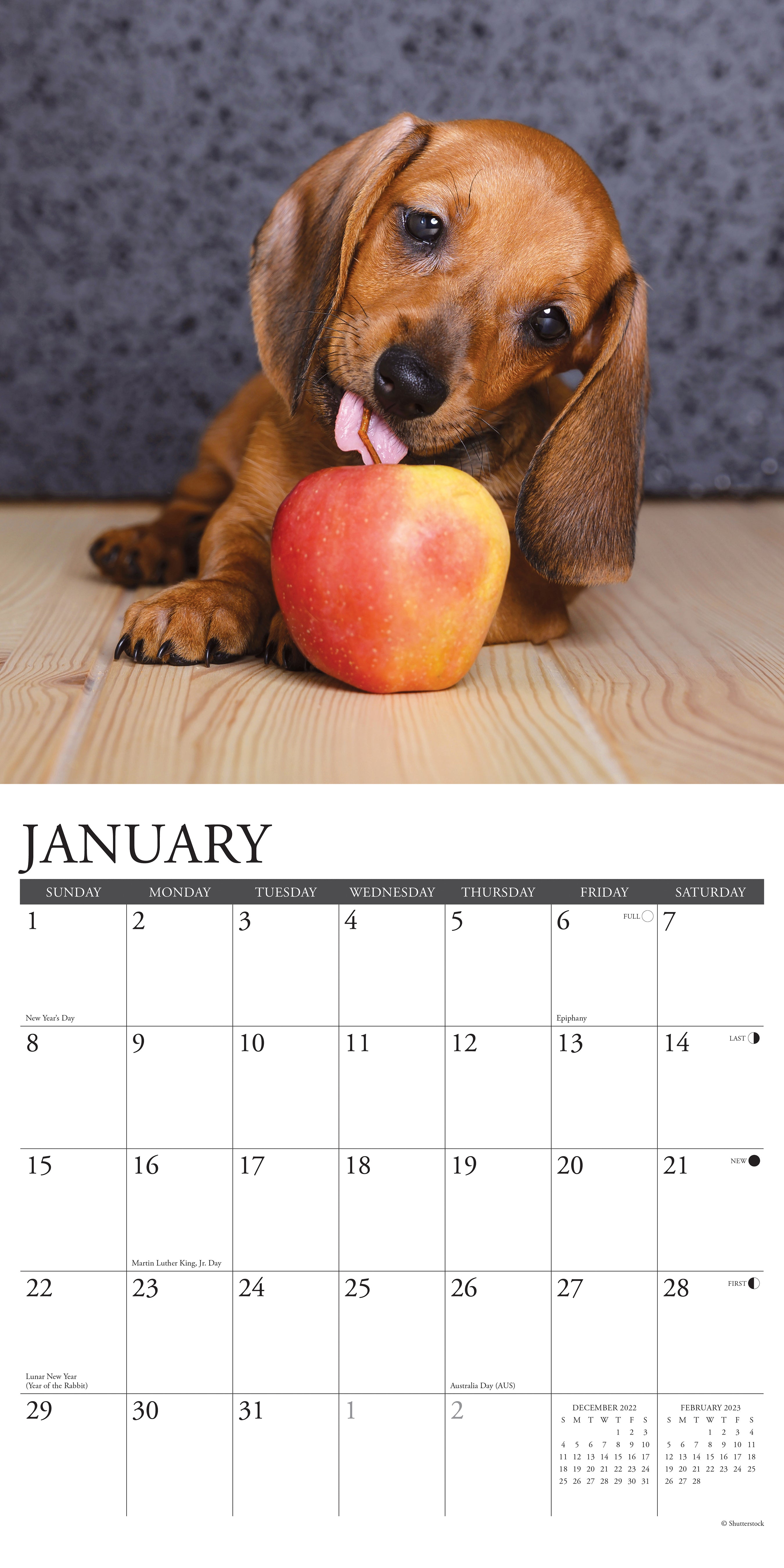 Is there anything cuter than Dachshund puppies? Their owners think not! These twelve heartwarming full color photos embody all that is sweet and cuddly about these little guys and gals. Printed with soy-based inks on FSC certified paper, this 12" x 12" wall calendar features large monthly grids that offer ample room for jotting notes, along with six bonus months of July through December of 2022. Also includes moon phases (CST), standard U.S. and international holidays.