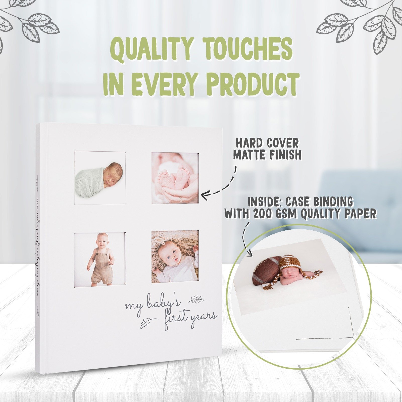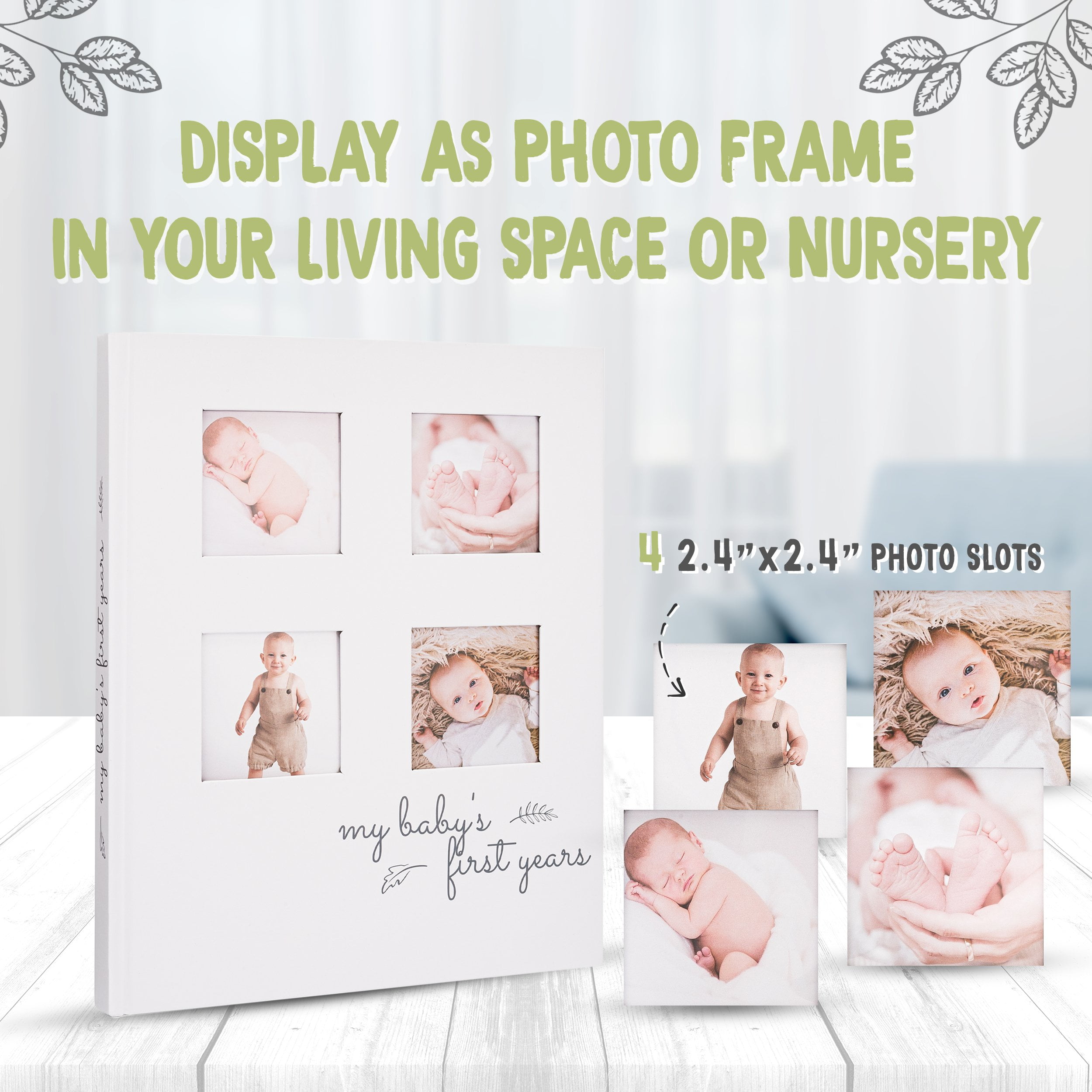 - Photo Book Frame – Double up as a Baby Album and Memory Book. Let your Baby First Year Book cover tell a great story about your baby’s growing journey. Showcase your baby’s cutest photos on the front cover. Our SKETCH Baby Book comes with 4 photo inserts on the front hardcover sized at 2.4” x 2.4” each and the book is bound with perfect binding to give it a slim and sleek look. Display it in your nursery, living space, or at a baby welcome party or first birthday party.