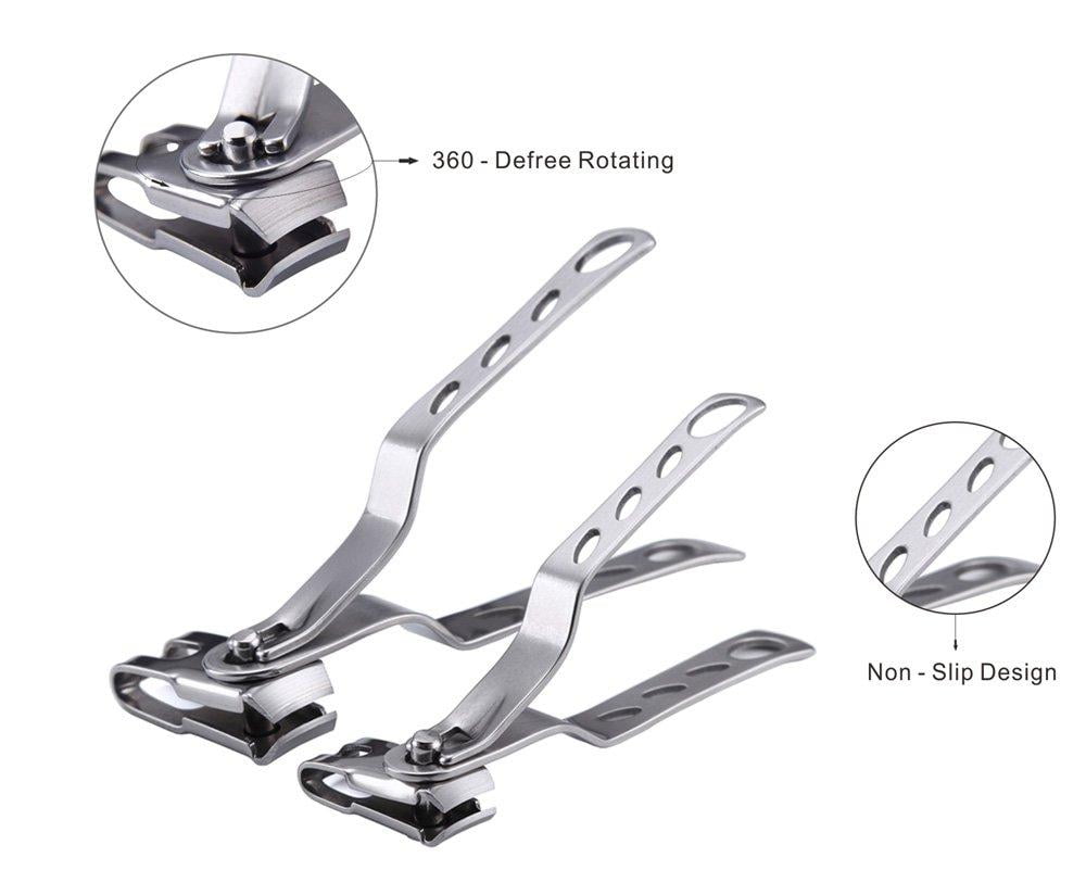 Made of top-quality stainless steel, never rusts, and is built to last a lifetime. Processed by special technology, have extreme hardness and is super sharp. 360-degree rotating head, no more awkward positions when clipping your nails. Comfortable grip the unique design prevents slipping and provides great leverage, great for seniors. This unique nail clipper comes with a 360-degree rotating head that makes cutting your nails easier by being able to adjust the head to clip your nails from more natural and comfortable angles, the large size is great for cutting thick nails and toenails.