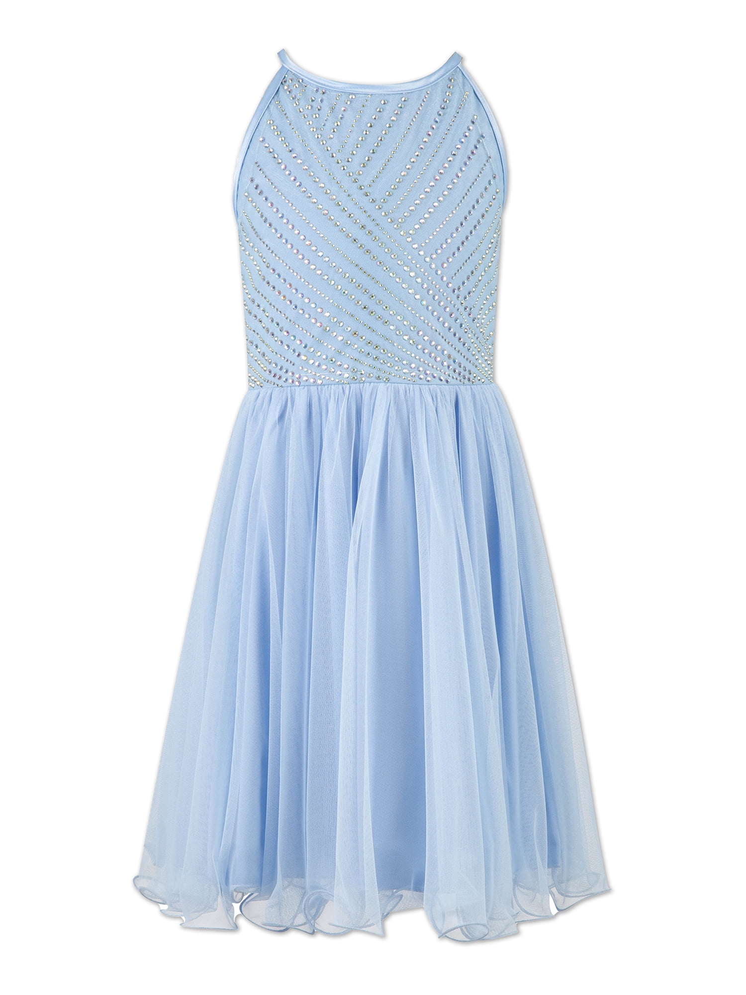This beautiful fit and flare party dress is a season must have. The bodice is sleeveless with a round neckline and is embellished with jewels. The skirt is tulle and knee length.