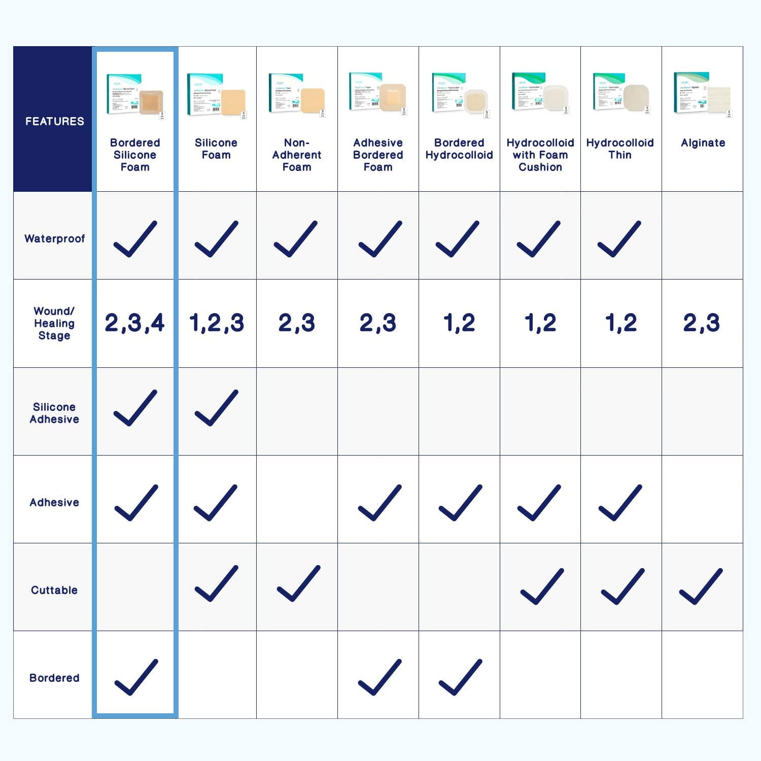 - Multilayer structure enhances absorbent capacity and locks the wound exude to prevent wound bed maceration.