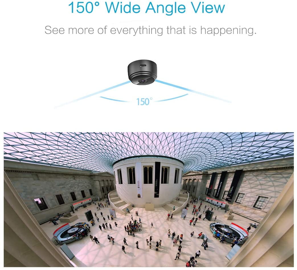- Wi-Fi Spy Camera of The latest version: This spy camera A9 is the latest wide angle Wi-Fi camera of small size with built-in magnet. Thanks to the 1080P and 150 Degree wide angle lens, the spy camera captures details clearly and give you a greater scope of view on everything that’s happening in the room. The compact design makes it easy to hide around anywhere like in the home or office. Perfect as surveillance camera in: office, home and car etc.