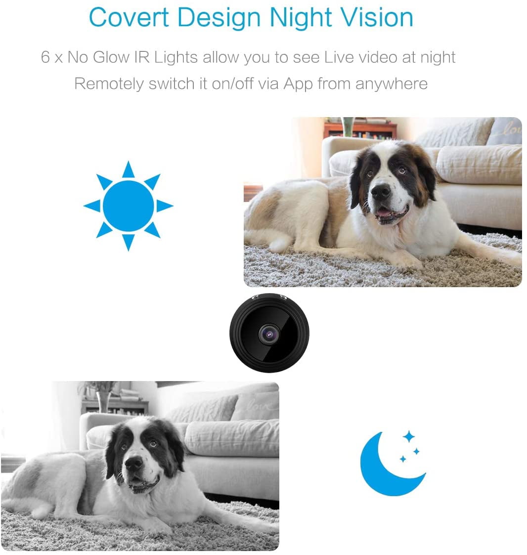- All in One Wireless Spy Camera: Although the camera is quite small, it comes with all useful features you need for a Wifi Mini camera: 150° Wide Angle, Built-in Magnet, 1080P Live Video, Motion Activated Push Alerts, No-Glow IR Night Vision, Recording while Charging, Playback/Snapshot/Record Remotely, iOS and Android Compatible, Live Stream from Anywhere, SD Card Recording, Free App, One App Multiple Camera, One Camera Multiple Users and More.