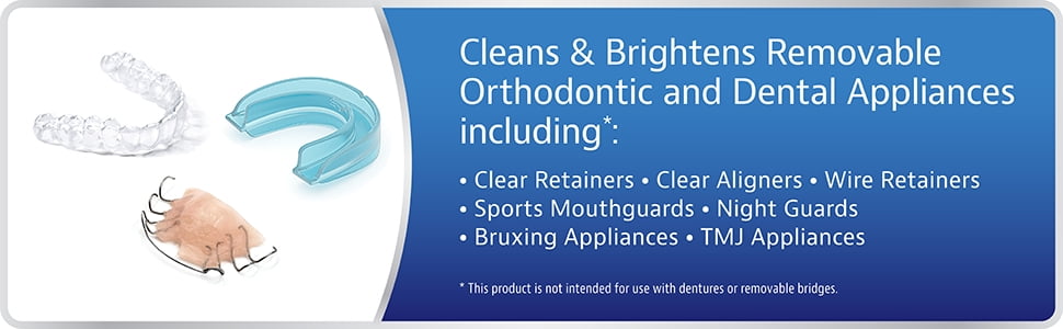 Cleans & Brightens Removable Orthodontic and Dental Appliances including Clear Retainers, Clear Aligners, Wire Retainers, Sports Mouth Guards, Night Guards, Bruxing Appliances, and TMJ Appliances