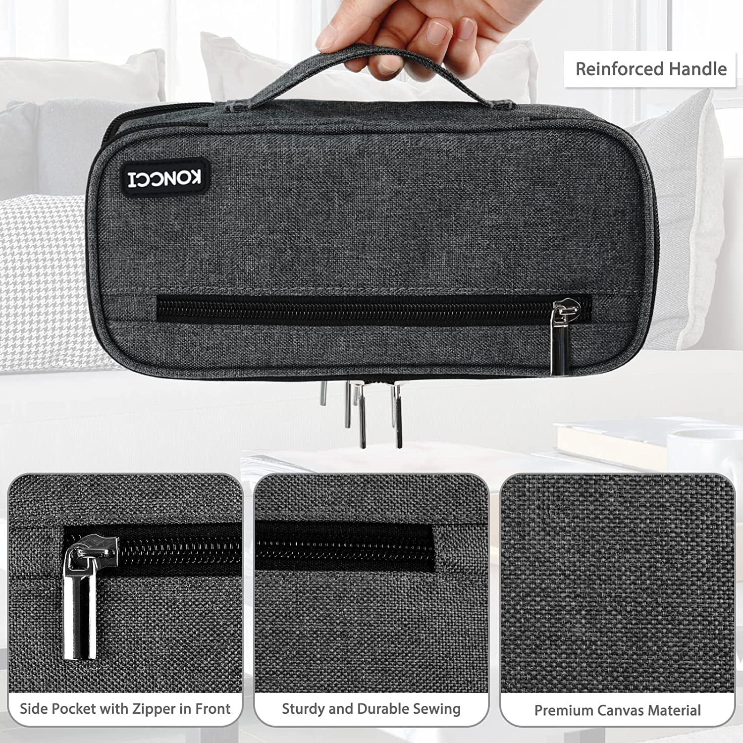- MULTI-FUNCTIONAL DESIGN – Reinforcement handle strap design makes the pencil pouch bag easy to carry. 3 Different compartments have individual functions and can be used as pen case, cosmetic makeup bag, office storage, travel case, craft pouch, tool pouch, daily organizer, cellphone pouch and more to fits all your basic daily needs for office, school, home and travel use.