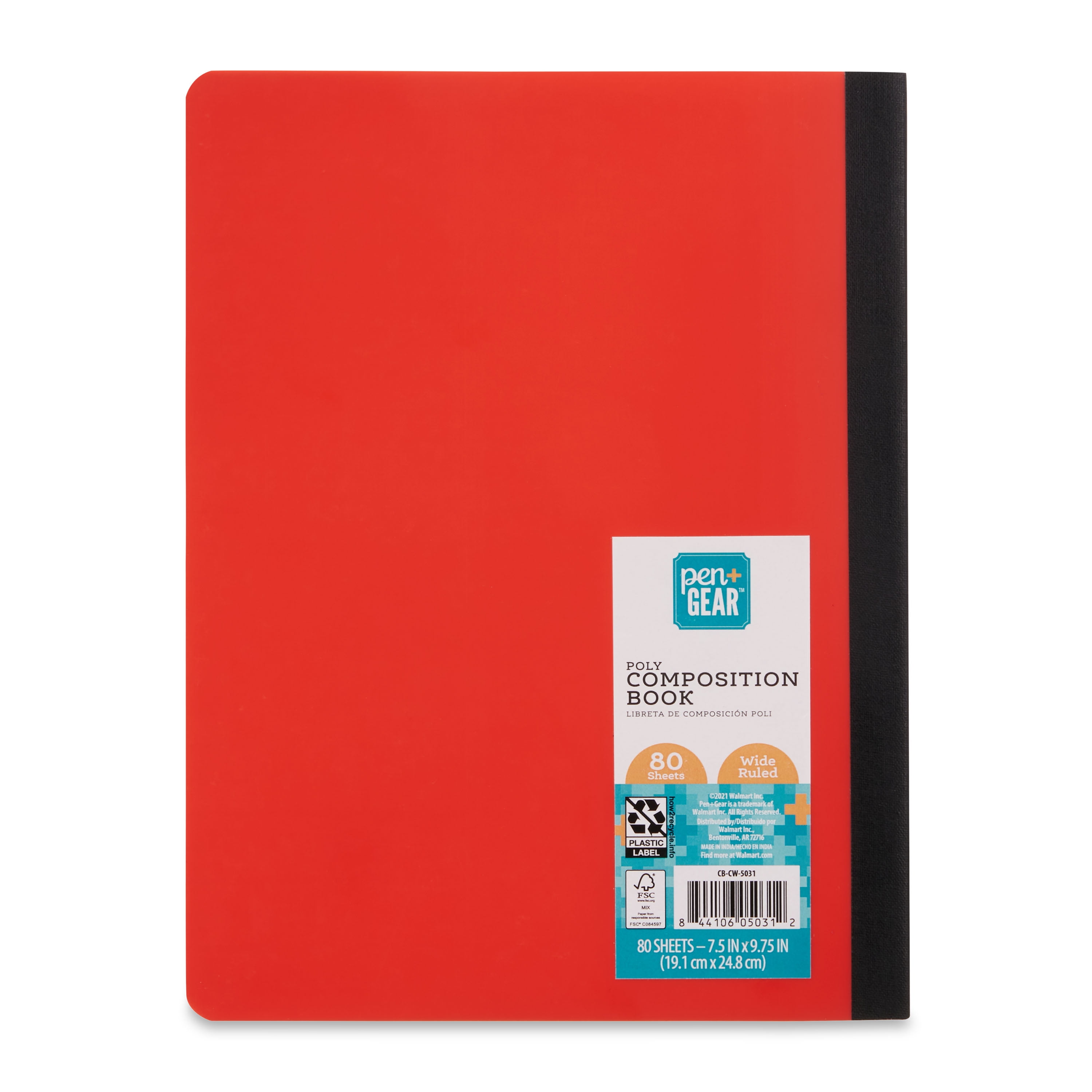 This Pen + Gear Poly composition book features a red, durable poly covers with a foil star design. The covers are flexible enough to lie flat when writing, and the poly cover ensure protection from spills and rough handling. These composition notebooks are a compact 7.5 inches by 9.75 inches, so you can easily carry one in your backpack, laptop bag or tote bag. The permanently bound pages keep your writings secure while the plastic covers help protect the pages from tears and spills. The composition book has 80 wide ruled pages. Pen+Gear Poly Composition Books are perfect all-purpose notebooks.