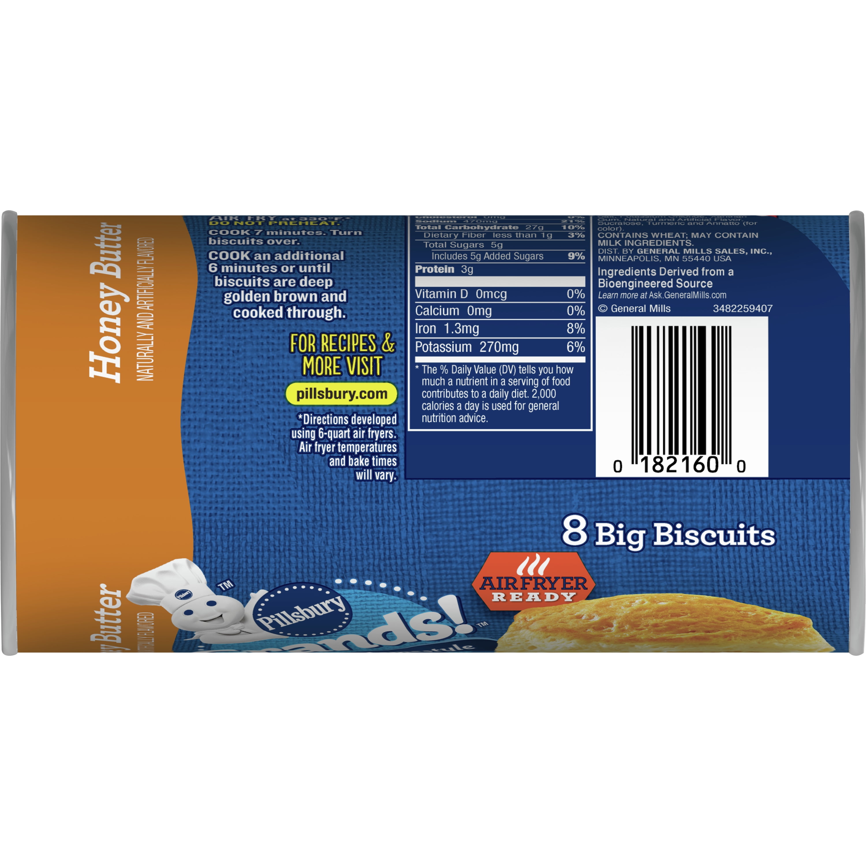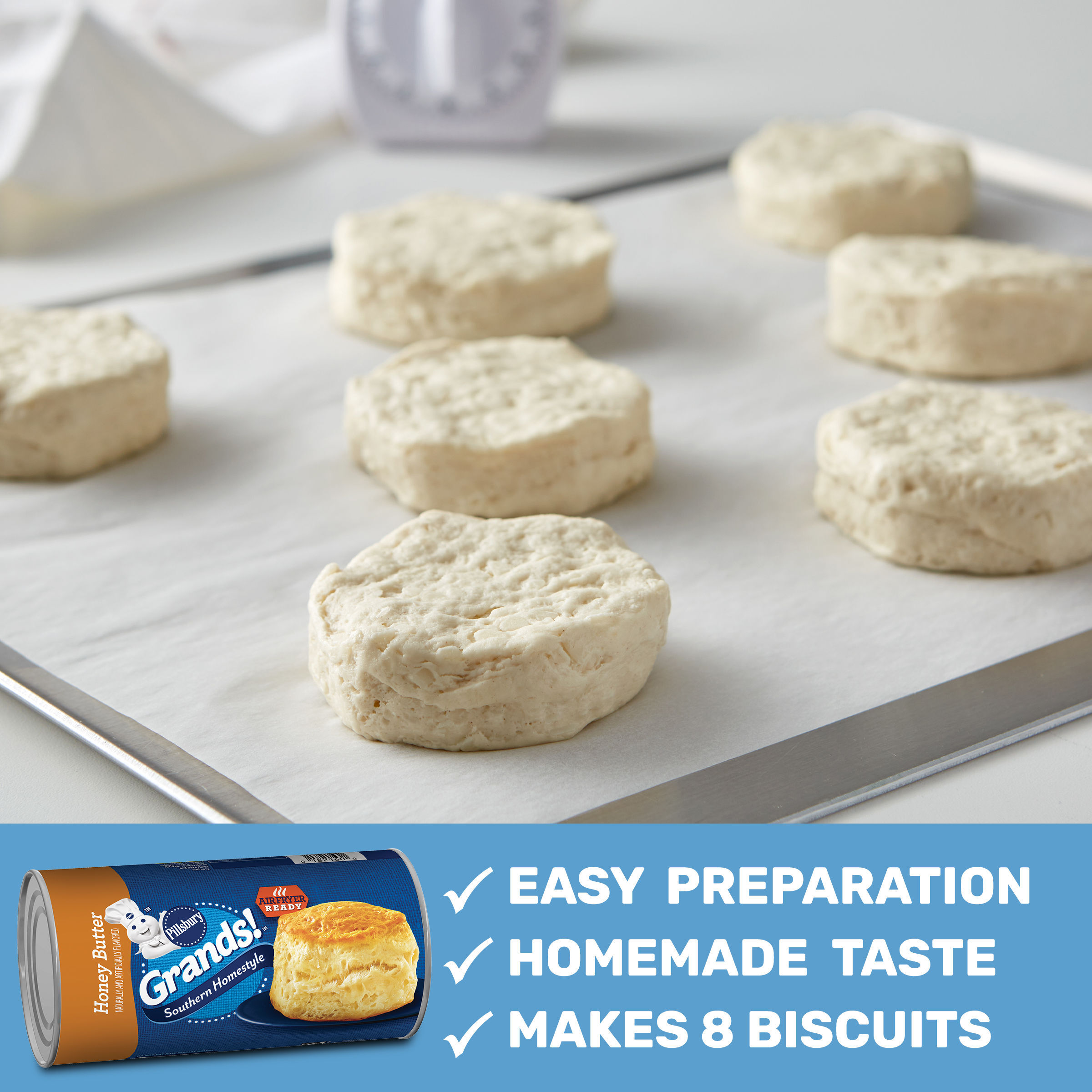 Help make family meals grand with the home-baked goodness of Pillsbury Grands! Southern Homestyle Honey Butter Biscuits. Each hot-out-of-the-oven Grands! biscuit has a mouthwatering crispy outside and fluffy inside. A convenient alternative to scratch baking, this canned biscuit dough is ready to bake and will help save you time and kitchen cleanup. In just minutes, the air will be filled with the delicious aroma of freshly baked biscuits. Plus, you can add an egg and cheese for an epic breakfast biscuit sandwich or serve with your favorite spreads. Imagine the memories you’ll make.Pillsbury Biscuits will give you time back in your day to focus on what matters. Simply preheat the oven to 350° F, place biscuits 1-2 inches apart on an ungreased cookie sheet and bake 13-17 minutes. They can also be made in an air fryer! In just a few simple steps, you’ll have homestyle biscuits without all the fuss!