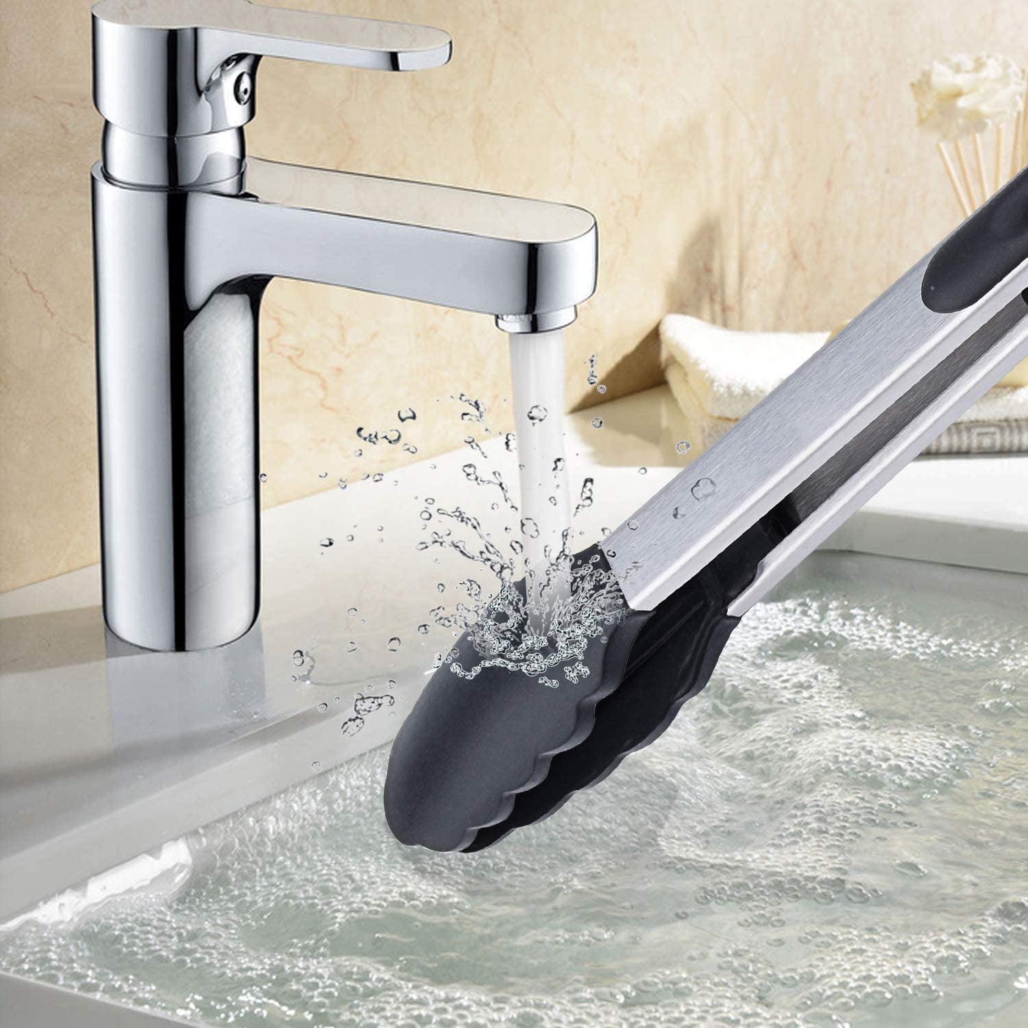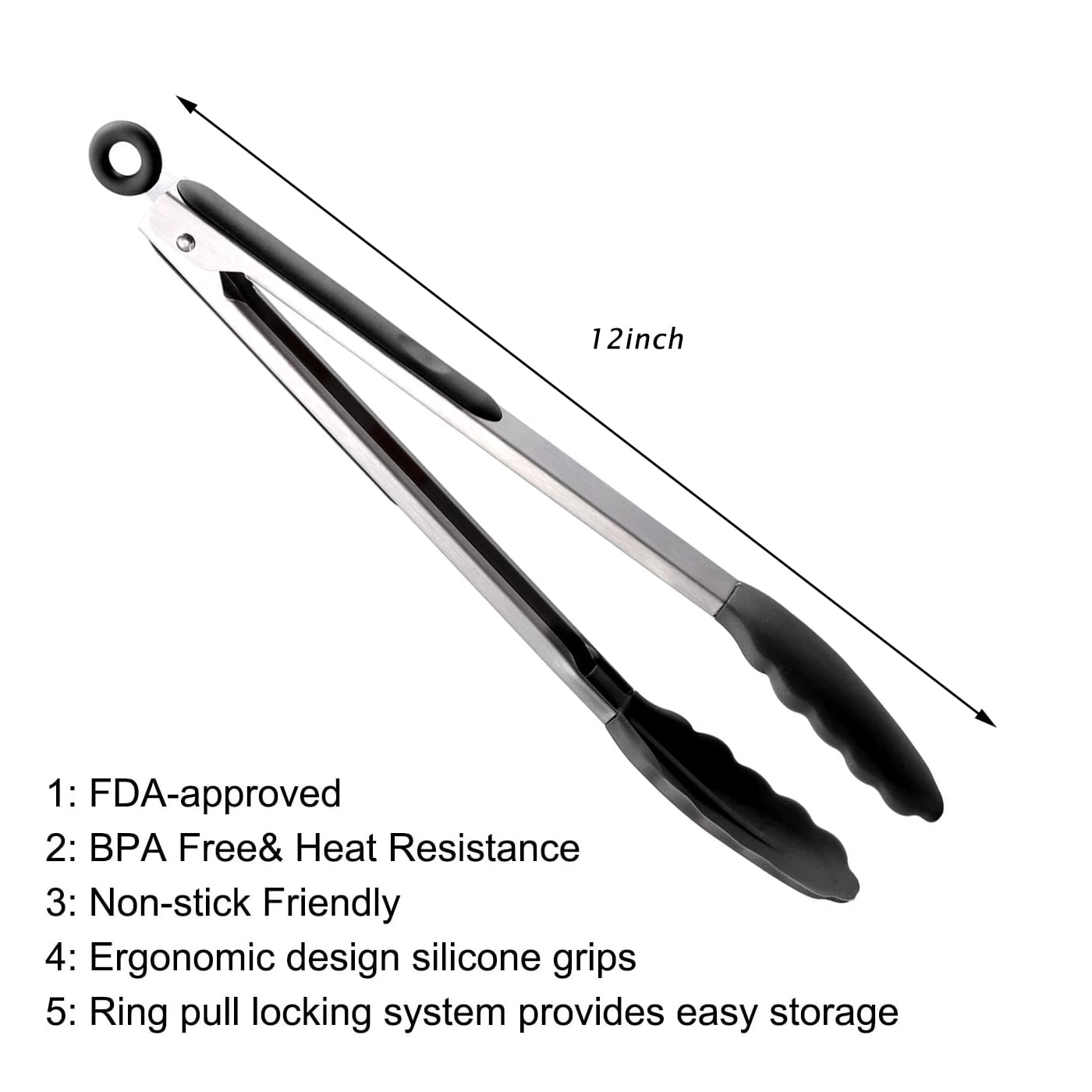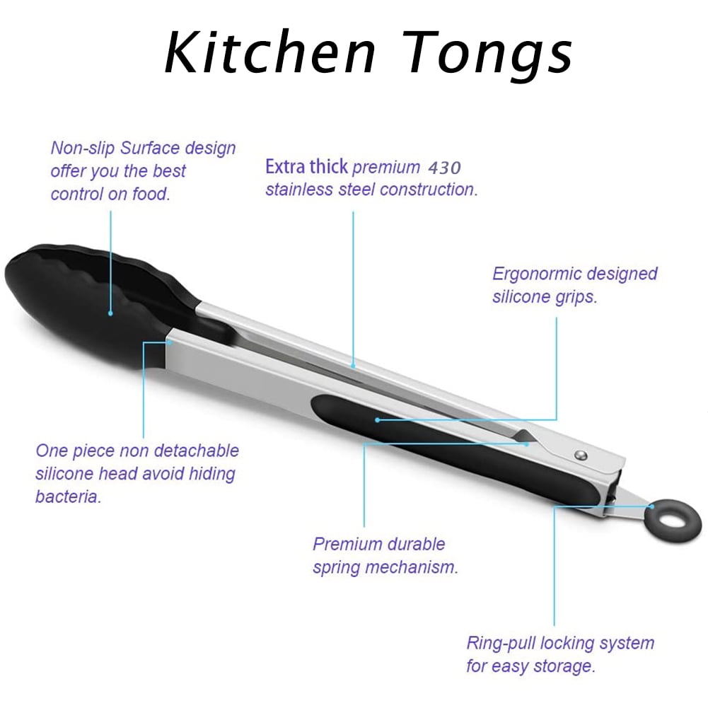 - The Kitchen Tongs with silicone tips offer the best grip and control available, rust or flake into your food. These tongs are made with extra thick 1.00mm and feature a ring-pull locking system which is made to last.