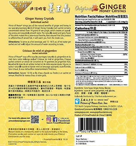 Prince of Peace brings you all the natural benefits of ginger and honey in our special proprietary blend of Ginger Honey Crystals. Each sachet contains concentrated extract for 14 grams of raw ginger, which creates an appealing aroma and exquisitely smooth taste. The naturally sweet and spicy flavor of this drink makes this a year-round favorite. rest assured that his product is caffeine-free. If served hot, it will warm you from the inside out.Makes Hot or Cold Beverage
